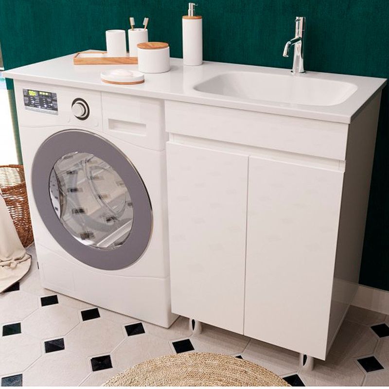 Тумба укомплектована раковиной из литьевого мрамора c глубокой чашей, плавными изгибами и вкладышем для слива. Раковина с большой столешницей удобная и функциональная. В тумбе 2 распашных дверцы со скрытыми ручками и полкой внутри, что делает использование максимально комфортным. Стиральная машина устанавливается под столешницей, за счет чего экономит место в ванной комнате.