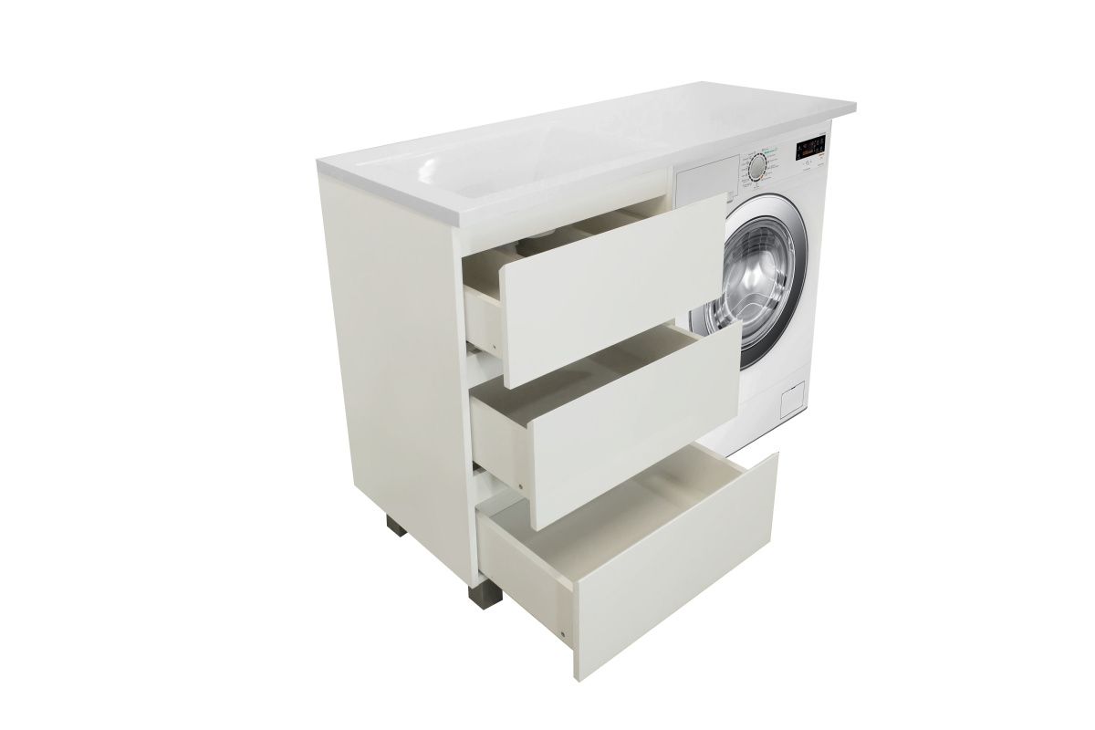 Приоритетом в выборе тумбы с раковиной является площадь ванной комнаты. Функциональная тумба с тремя ящиками решит вопрос для большинства покупателей. Тумба укомплектована раковиной из литьевого мрамора с удобной чашей, стиральная машина устанавливается под столешницей.  Три ящика позволят распределить как крупные, так и мелкие вещи.