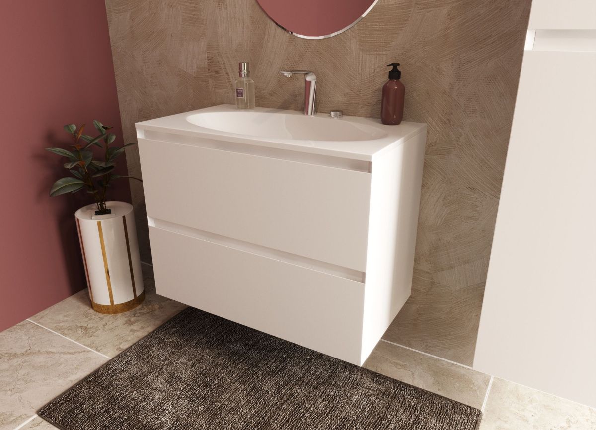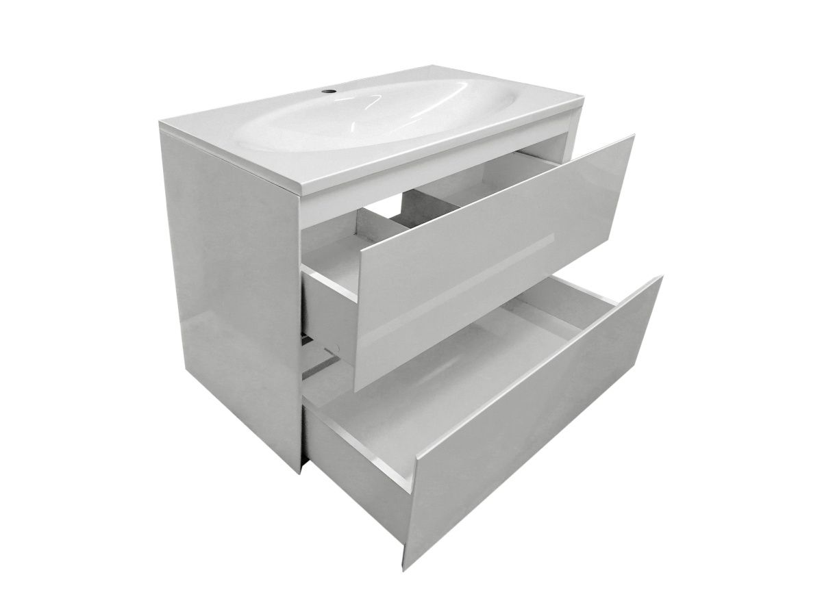 Подвесная тумба укомплектована прямоугольной раковиной из литьевого мрамора, плавно перетекающая в овальную чашу, которая добавляет изящность мебели и передает атмосферу стиля. В тумбе расположены 2 вместительных ящика, интегрированные ручки выполнены за счет скошенных фасадов. Мебель выполнена из влагостойкого ЛДСП и качественного MDF с использованием эмали RENNER (Италия). Ящики снабжены системой плавного закрывания. Для мебели используется фурнитура Samet (Турция).