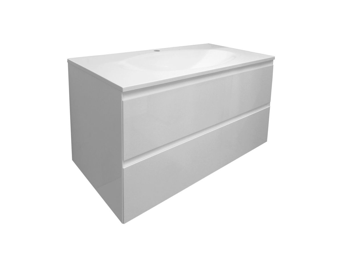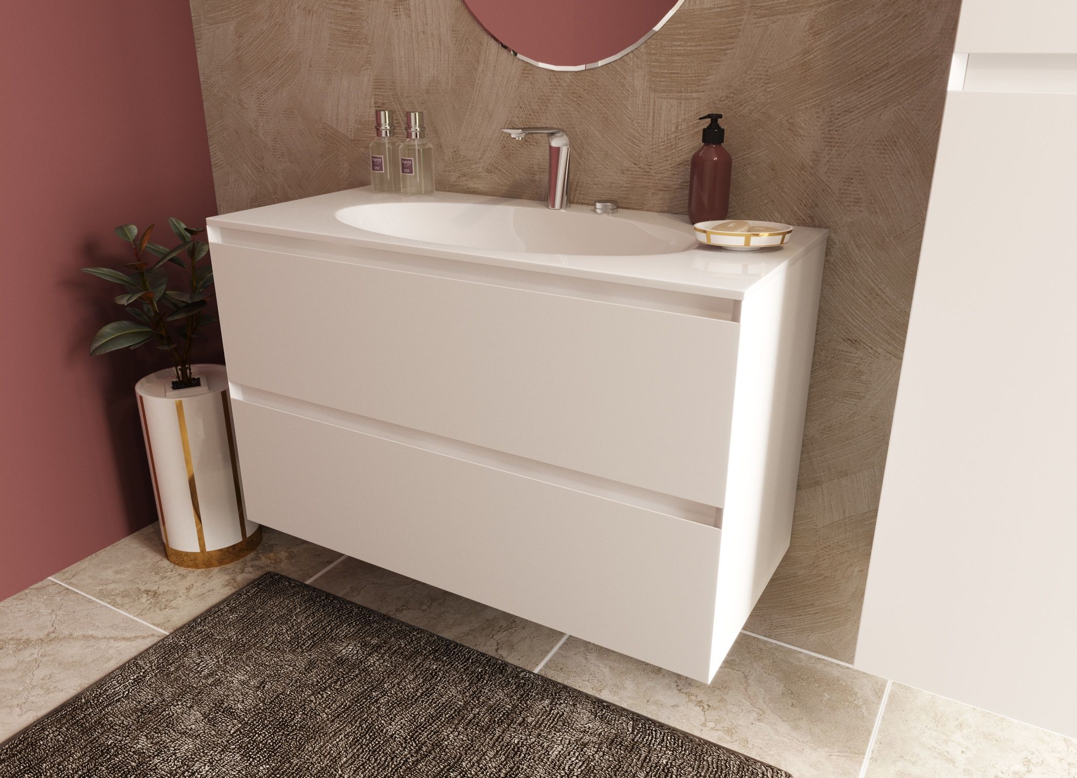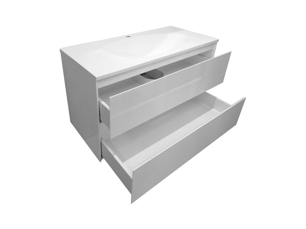 Подвесная тумба укомплектована прямоугольной раковиной из литьевого мрамора, плавно перетекающая в овальную чашу, которая добавляет изящность мебели и передает атмосферу стиля. В тумбе расположены 2 вместительных ящика, интегрированные ручки выполнены за счет скошенных фасадов. Мебель выполнена из влагостойкого ЛДСП и качественного MDF с использованием эмали RENNER (Италия). Ящики снабжены системой плавного закрывания. Для мебели используется фурнитура Samet (Турция).