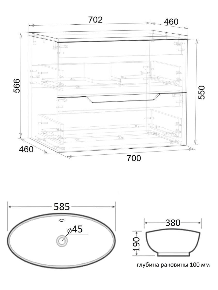 Тумба подвесная с накладной раковиной Orange Line отличается современным дизайном. Изготовлена из МДФ высокой плотности. Мебель покрыта пленкой ПВХ  с технологией Soft Touch — ламинация класса премиум, с повышенными тактильными свойствами. Пленка обеспечивает дополнительную защиту мебели от влаги и перепадов температуры. На ящики установлены комплекты скрытых направляющих Hettich, обеспечивающие полное выдвижение и имеющие встроенную систему плавного и бесшумного закрывания. Исполнение - матовое. Материал раковины - фарфор. Отверстия в столешнице под раковину и смеситель монтируются самостоятельно. Донный клапан приобретается отдельно.
