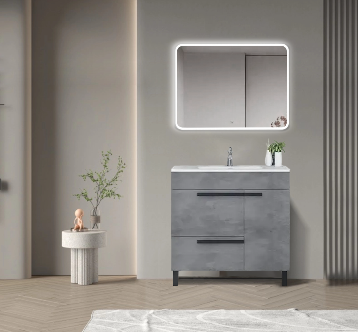 Этот скромный комплект мебели с тумбой в цементно-сером цвете с простым внешним видом, демонстрирующим красоту минимализма, оснащен различными передовыми технологиям, такими как плавное закрытие DTC, снижающее шум при закрытии и обеспечивающее тишину при использовании. Более того, в этом шкафу предусмотрено довольно большое пространство для хранения. Этот шкаф серии Gill действительно экономичен и заслуживает того, чтобы вы его приобрести в ванную комнату!