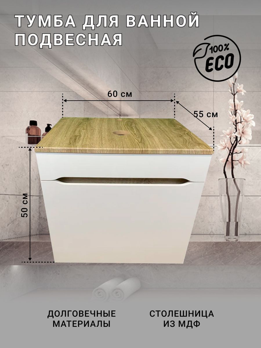Тумба Style-60-W7018 - современное и оригинальное решение для оснащения ванной комнаты. Подвесная тумба Style-60 изготовлена из экологически чистых и удивительно долговечных материалов, которое не уступают ведущим немецким технологиям и обеспечивают насыщенный цвет в течение всего срока службы (от 10 лет). Размеры тумбы: ширина 60 см, высота 50 см, глубина 55 см. Столешница: МДФ.