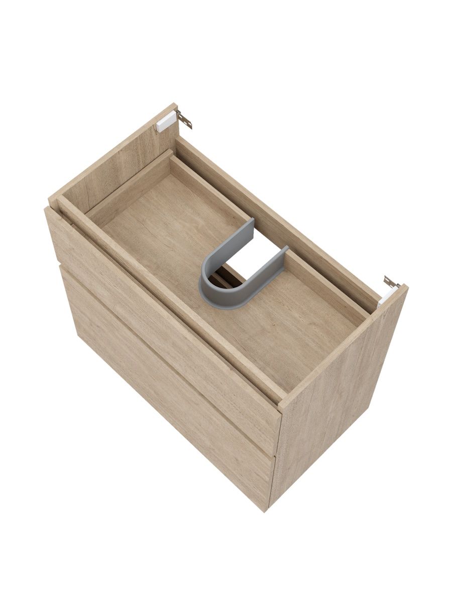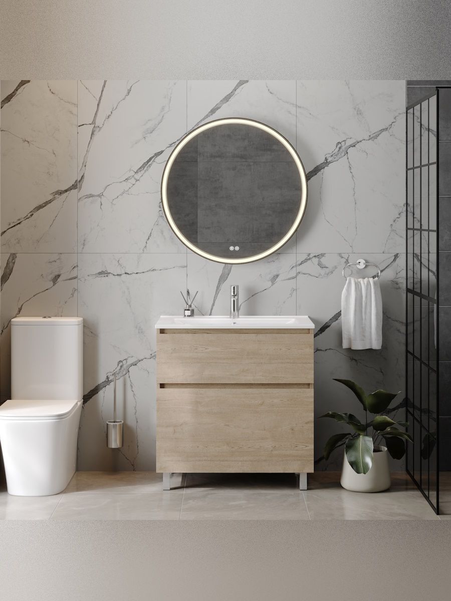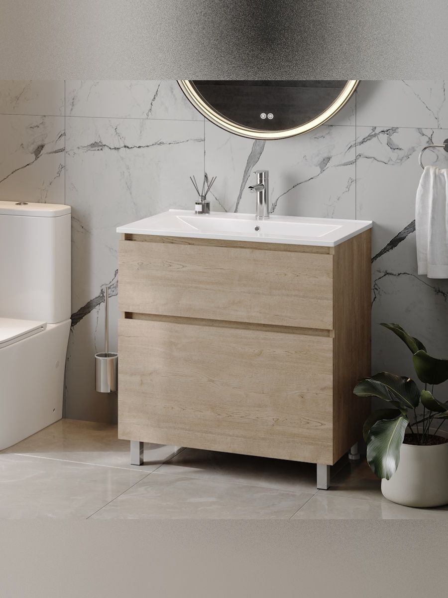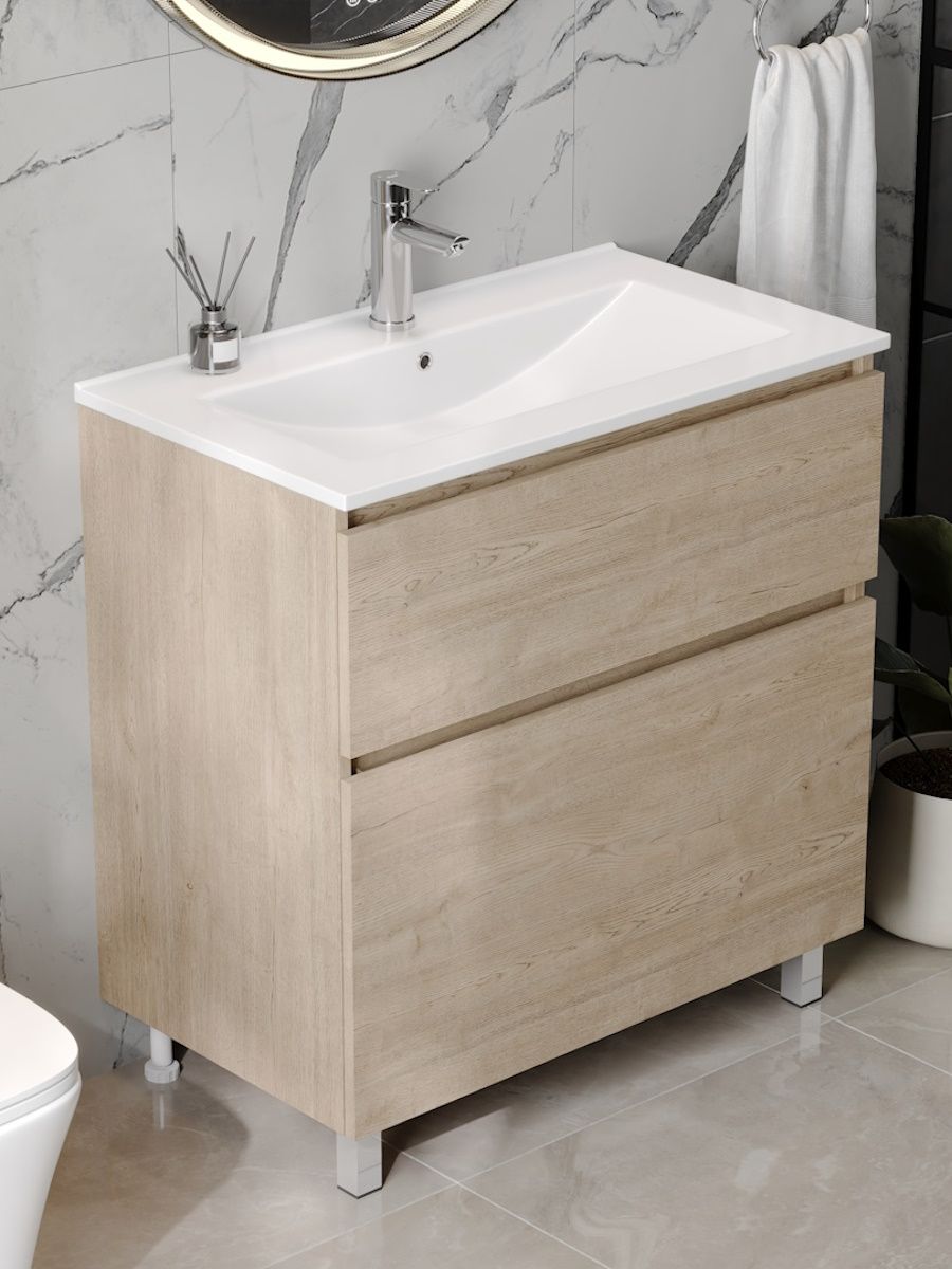 Тумба напольная с раковиной для ванной 80 см Laina дуб светлый, умывальник Ritta 80 F16051 от бренда Teymi — это стильное и практичное решение для просторных санузлов. Модель из коллекции Laina сочетает натуральный оттенок древесины с белоснежной керамикой, создавая гармоничный интерьер в стиле лофт или современный минимализм. Тумба выполнена в прямоугольной форме и имеет размеры 803×460×502 мм, высота ножек — 90 мм, полная высота от пола вместе с раковиной — 612 мм. Напольная конструкция обеспечивает устойчивость, а универсальная ориентация позволяет разместить мебель независимо от планировки комнаты. Корпус произведён из прочного ЛДСП, фасады — из МДФ с матовым покрытием ПВХ‑плёнкой. Светлый древесный тон придаёт мебели лёгкость и зрительно делает пространство более просторным. Функциональность обеспечивают два вместительных выдвижных ящика с направляющими скрытого монтажа и доводчиками. Такое решение гарантирует плавное открывание и мягкое закрывание, что делает использование комфортным и продлевает срок службы механизма. Внутренние секции позволяют хранить косметику, текстиль и аксессуары, помогая поддерживать порядок. В комплект входит умывальник Ritta 80, выполненный из санфарфора. Размеры раковины составляют 810×465×170 мм, глубина чаши — 105 мм. Чаша с белой глянцевой поверхностью имеет отверстие под смеситель и перелив, а также стандартный слив диаметром 45 мм. Удобные боковые крылья шириной по 170 мм с каждой стороны создают дополнительное пространство для размещения мыльницы, средств ухода или декоративных элементов. Глянцевая поверхность устойчива к влаге и легко очищается, сохраняя блеск и белизну. Изделие поставляется полностью собранным, что значительно облегчает процесс установки. В упаковке предусмотрены тумба, умывальник, крепёжные элементы и документация. Производитель гарантирует надёжность и качество, предоставляя гарантию сроком на два года. Тумба с раковиной Laina 80 дуб светлый — это удобное и эстетичное решение для ванной комнаты, которое сочетает функциональность, надёжность и современный стиль в одном комплекте.
