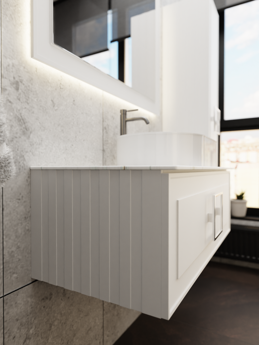 С мебелью коллекции Cubo решить задачу будет проще. Матовые фасады подвесных тумб и столешницы в различных цветовых гаммах помогут даже самому взыскательному покупателю создать индивидуальный интерьер. Изящные и утончённые фрезерованные фасады и боковины тумб в сочетании неповторимым цветом молочно-белая станут украшением любой ванной комнаты.