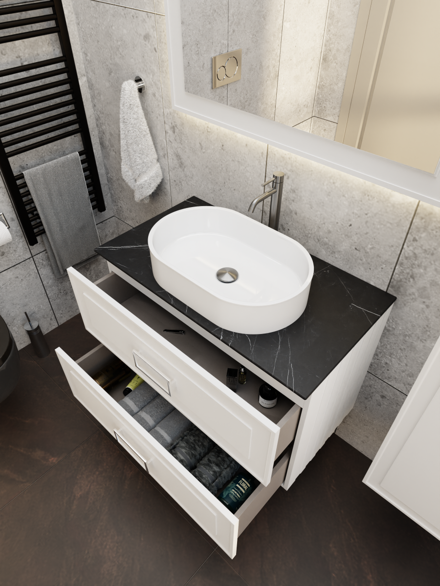 С мебелью коллекции Cubo решить задачу будет проще. Матовые фасады подвесных тумб и столешницы в различных цветовых гаммах помогут даже самому взыскательному покупателю создать индивидуальный интерьер. Изящные и утончённые фрезерованные фасады и боковины тумб в сочетании неповторимым цветом молочно-белая станут украшением любой ванной комнаты.