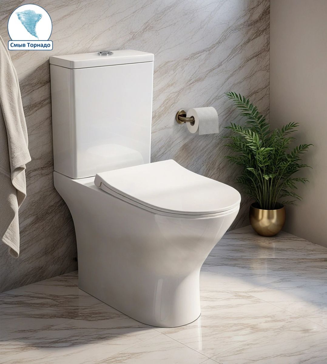 Смыв в унитазе происходит по принципу TORNADO – поступающая из отверстия в чаше вода мощным потоком закручивается (эффект водоворота) и полностью очищает всю внутреннюю поверхность чаши. При этом воды требуется на качественный смыв в небольшом количестве.