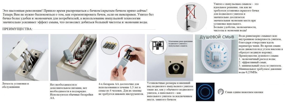 Для импульсных унитазов не требуется резервуар (бачок) для воды. Подвод холодной воды из трубопровода осуществляется непосредственно к унитазу через гибкую подводку (шаровый кран с ½ на ¾ в комплекте). Это экономит пространство, делает помещение визуально просторнее и легче, а также не требует сложного ремонта (отсутствует необходимость в установке инсталляции, и, как следствие - при поломке не потребует дорогостоящего ремонта с демонтажем стены). Все что потребуется - заменить деталь на новую зап.часть.