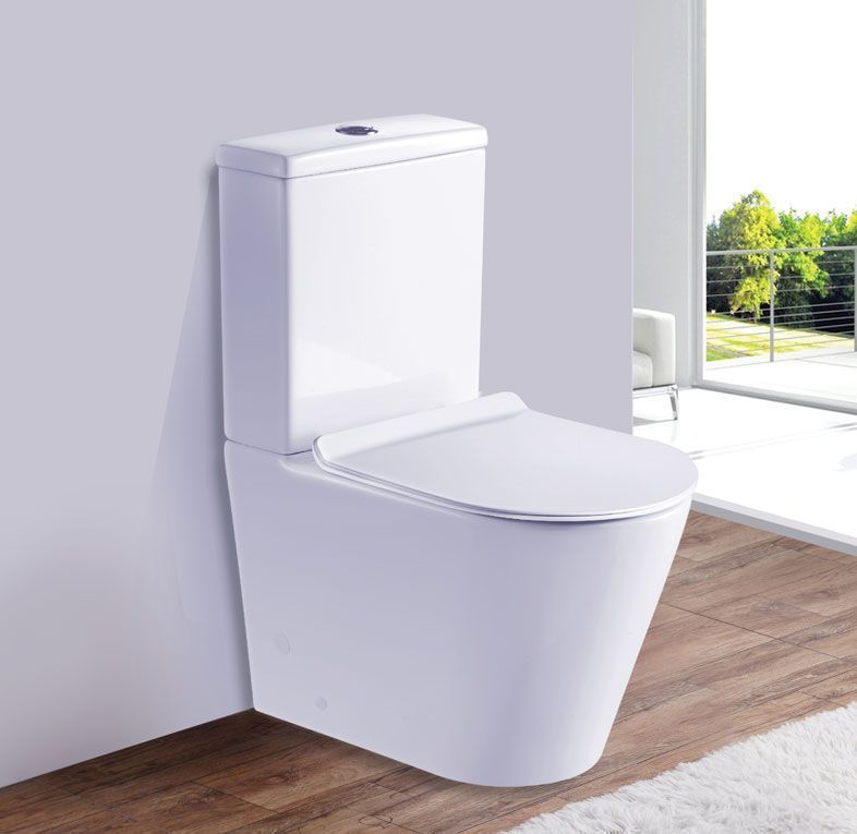 БЕЗОБОДКОВЫЙ напольный унитаз. Бортик по периметру чаши. Горизонтальный выпуск ("P-Trap"). Нижний подвод воды. Цвет: белый. Арматура: "GEBERIT" с двойной кнопкой слива (4/6 л).                                  Сиденье: тонкое, быстросъёмное, дюропласт с металлическим крепежом и микролифтом (механизм "Soft Close").