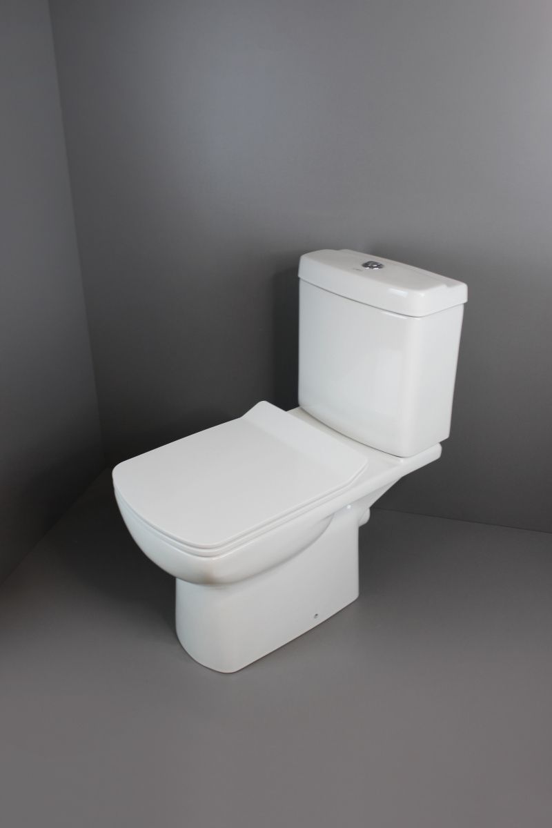 Керамический унитаз-компакт прямоугольной формы с  горизонтальным сливом. В комплекте поршневая арматура - двойной слив 3\6л. Наливной механизм с резьбой 1\2", подвод снизу. Дюропластовое быстросъемное тонкое сидение с функцией soft-close                                                                                           Металлические крепления сливного бачка                                                         Крепление к полу в комплекте. Сантехнический фарфор.Дюропластовое сиденье с функцией soft-close. Крепление в комплекте.