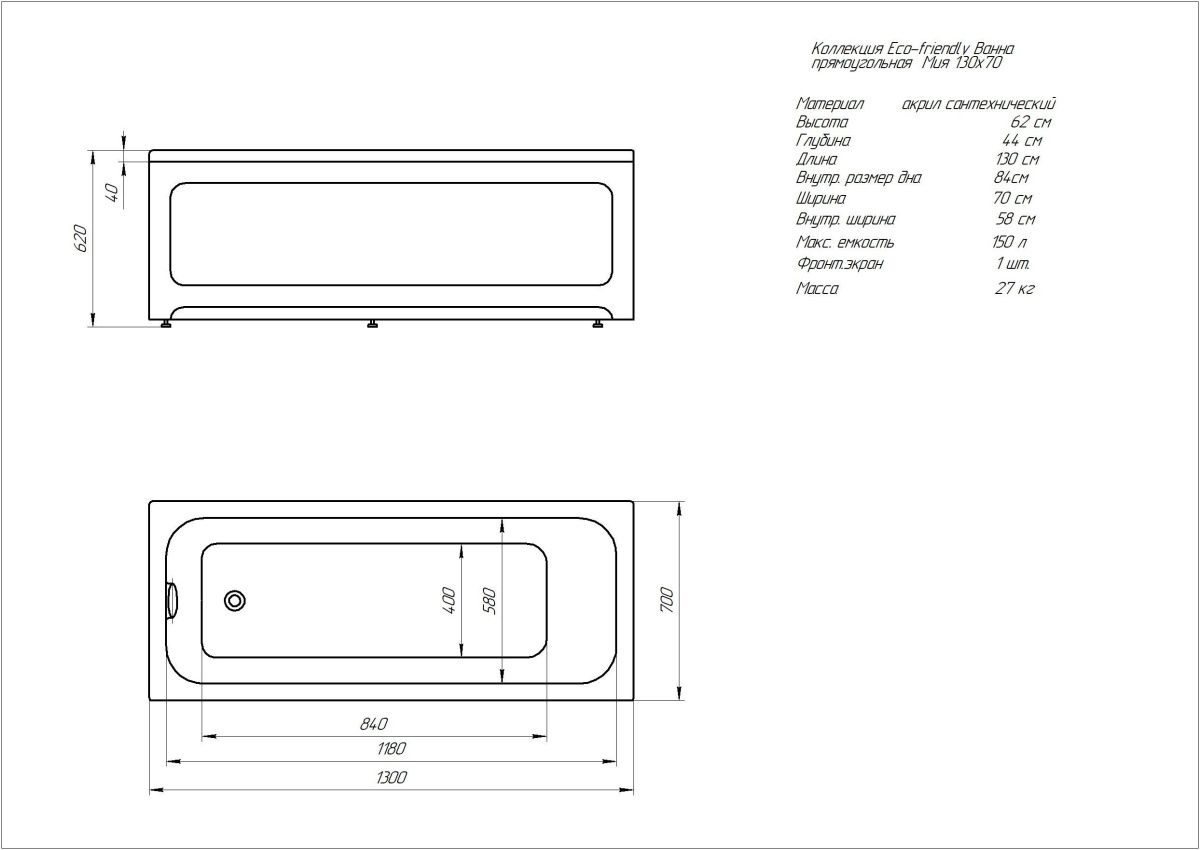 Ванна Aquatek Мия серии EcoFriendly изготовлена из 100% акрилового листа толщиной 3,2 мм. Дно ванны дополнительно усилено толстым листом ДСП. Конструкция является надежной и долговечной.
