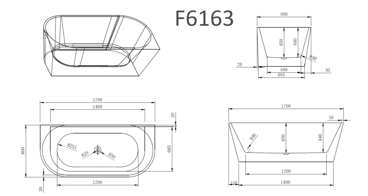 —Ванна акриловая Frank 12530 170х80 пристенная овальная с ножками