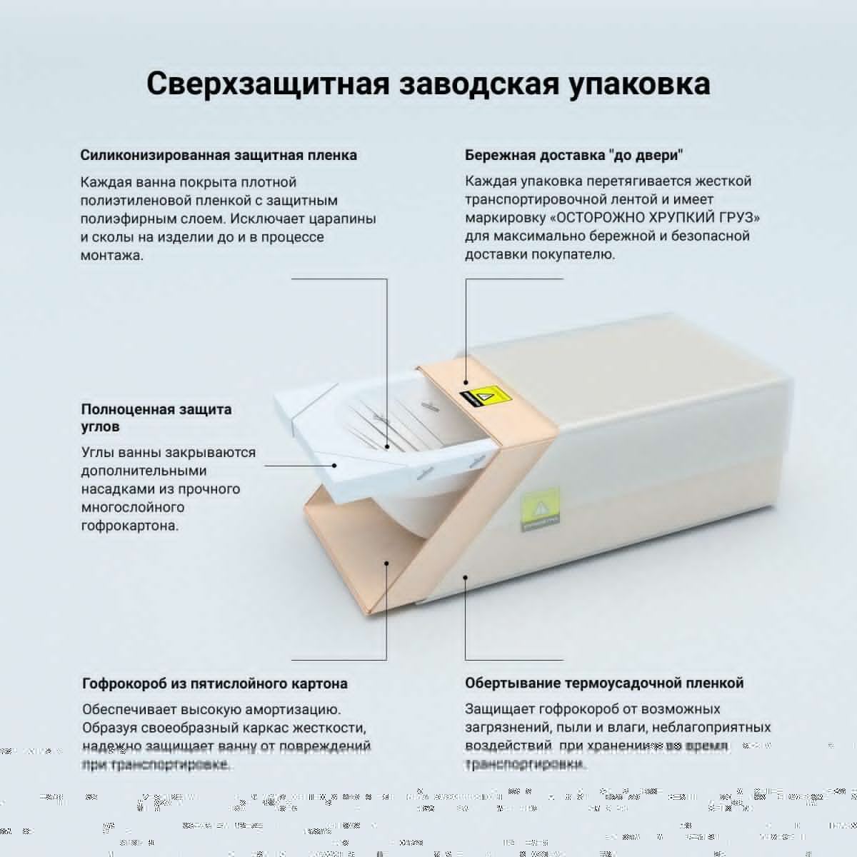 На акриле не накапливается грязь, не развиваются бактерии, ванна не желтеет и сохраняет равномерный глянцевый блеск. Ванны не подвержены истиранию, выцветанию и воздействию ультрафиолета, устойчивы к царапинам и жесткой воде. Каждое изделие проходит многоступенчатую проверку качества на геометрию и надежность.