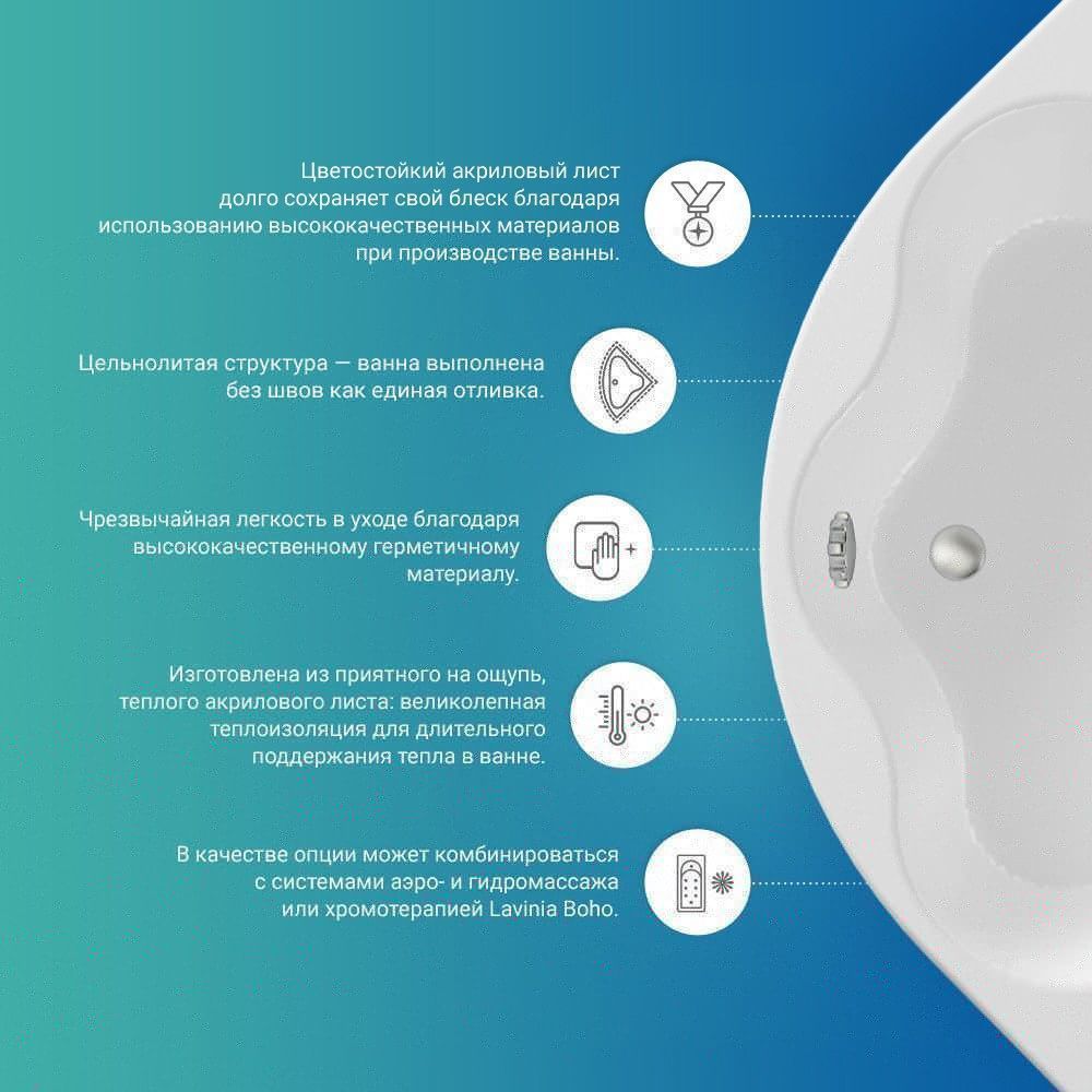 На акриле не накапливается грязь, не развиваются бактерии, ванна не желтеет и сохраняет равномерный глянцевый блеск. Ванны не подвержены истиранию, выцветанию и воздействию ультрафиолета, устойчивы к царапинам и жесткой воде. Каждое изделие проходит многоступенчатую проверку качества на геометрию и надежность.