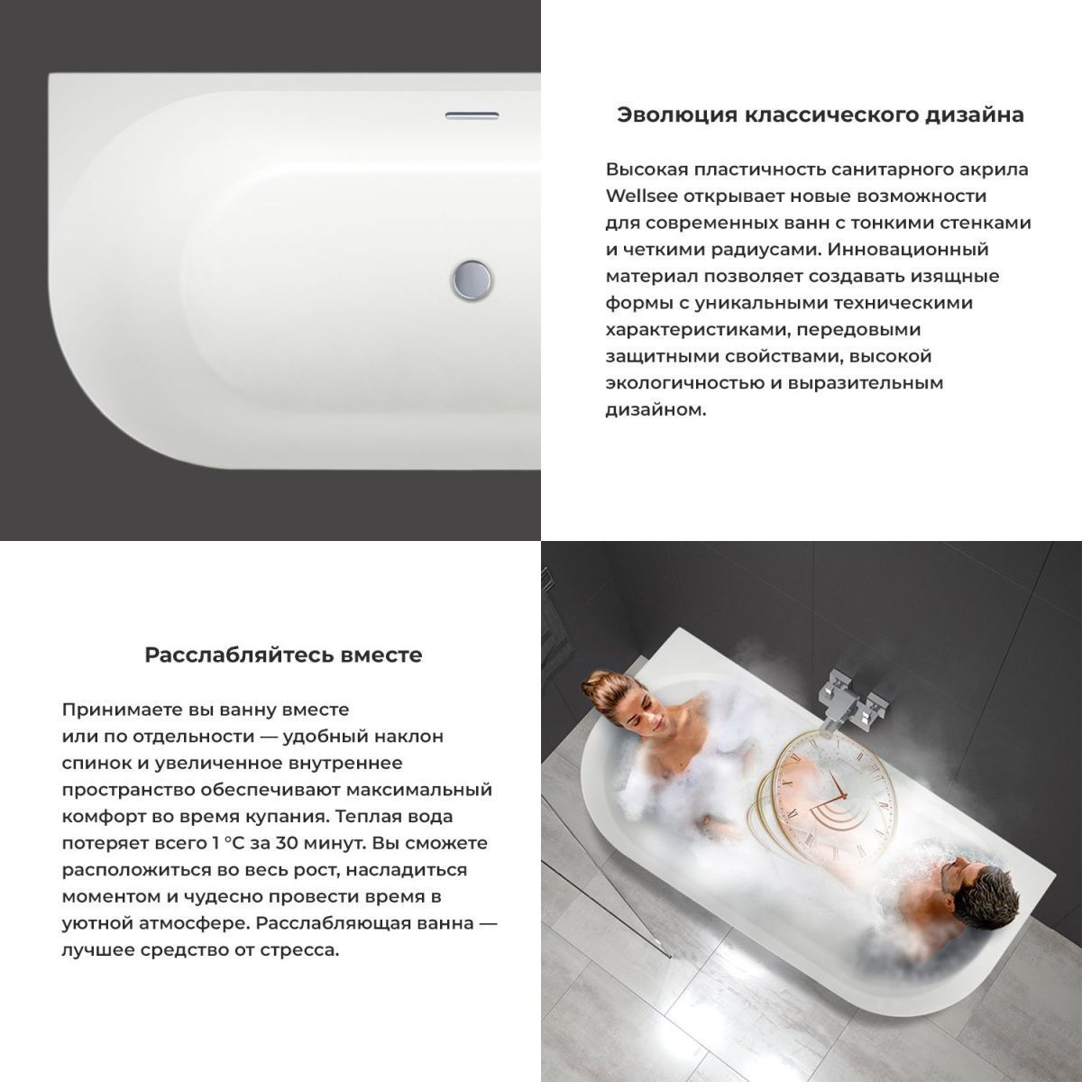 Основа ванн из литьевого акрила — жесткий 5 мм лист полиметилметакрилата, полученный из жидкого мономера методом полимеризации. Максимальная плотность материала и отсутствие микропор гарантируют исключительную гигиеничность изделия и легкий уход. Надежные опорные системы прочно фиксируют акриловые ванны Wellsee, исключая любые прогибания корпуса или опрокидывание изделия. Базовое исполнение ванн Wellsee может быть дополнено системами аэро- и гидромассажа, хромо- и ароматерапии, подсветкой, bluetooth-колонками и подголовниками.