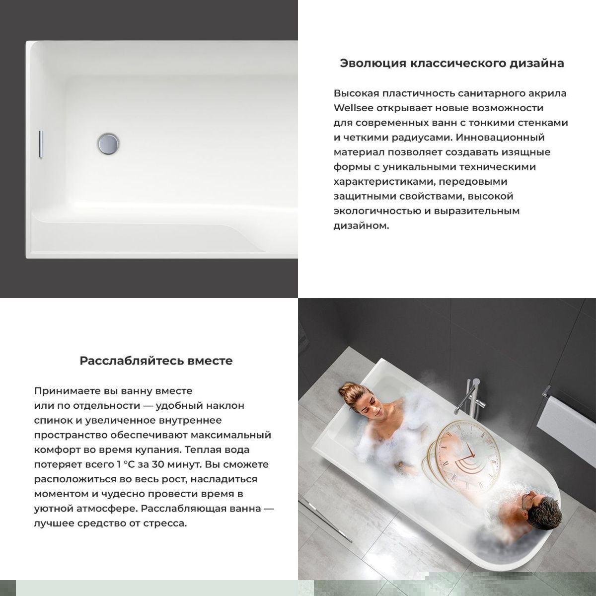 Основа ванн из литьевого акрила — жесткий 5 мм лист полиметилметакрилата, полученный из жидкого мономера методом полимеризации. Максимальная плотность материала и отсутствие микропор гарантируют гигиеничность изделия и легкий уход. Опорные системы прочно фиксируют акриловые ванны Wellsee, исключая любые прогибания корпуса или опрокидывание изделия. Базовое исполнение ванн Wellsee может быть дополнено системами аэро- и гидромассажа, хромо- и ароматерапии, подсветкой, bluetooth-колонками и подголовниками.