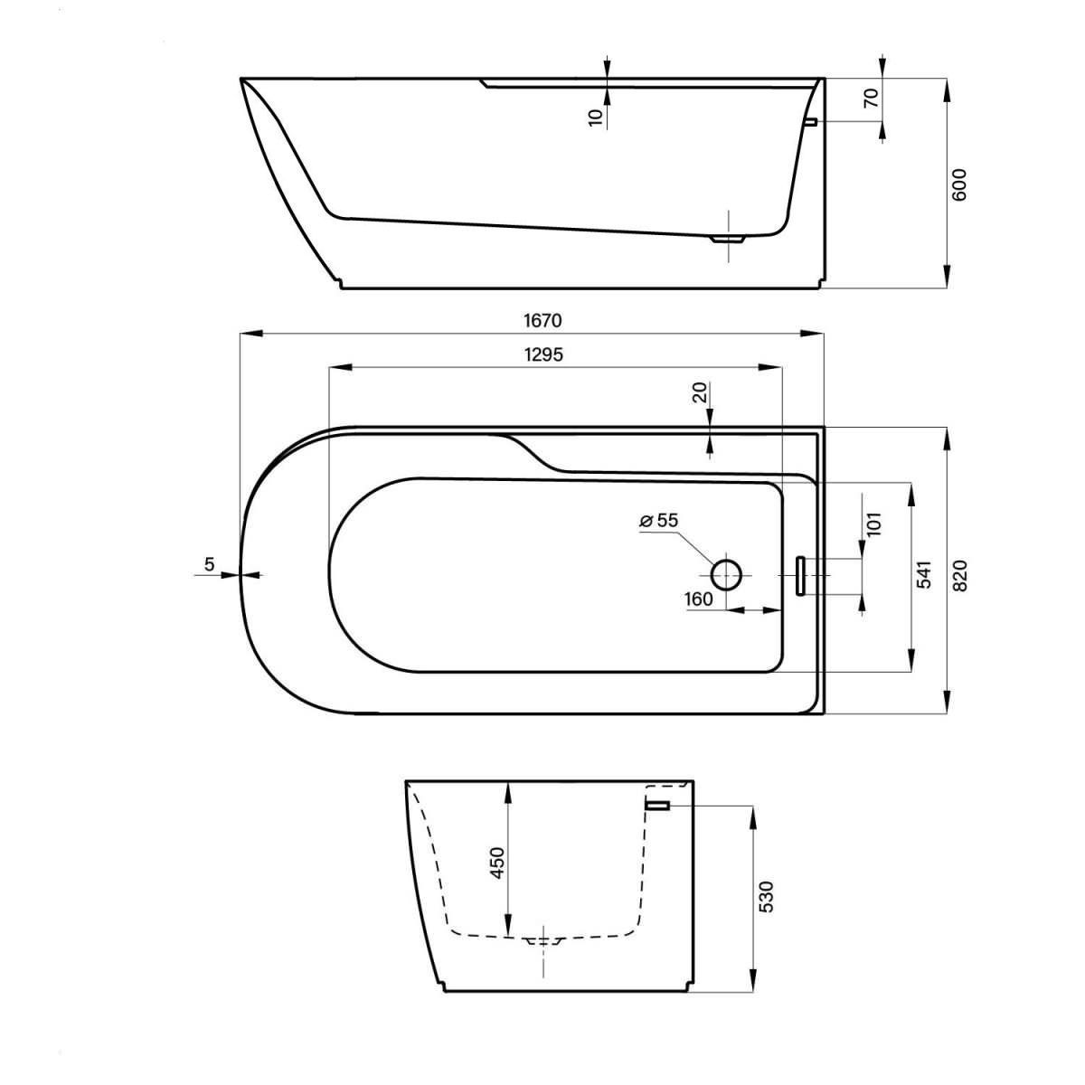Отдельностоящая модель представлена в размере 167*82 см в лево- и правостороннем исполнении. Свободный монтаж позволяет размещать ванну в любой интерьерной зоне: от пристенных угловых позиций до установки в центре помещения или возле панорамных окон. Отличительной чертой изделия стало увеличение внутреннего пространства чаши за счет сокращения площади фигурного борта. Широкий усиленный борт станет идеальной площадкой для установки смесителя или же размещения предметов гигиены.