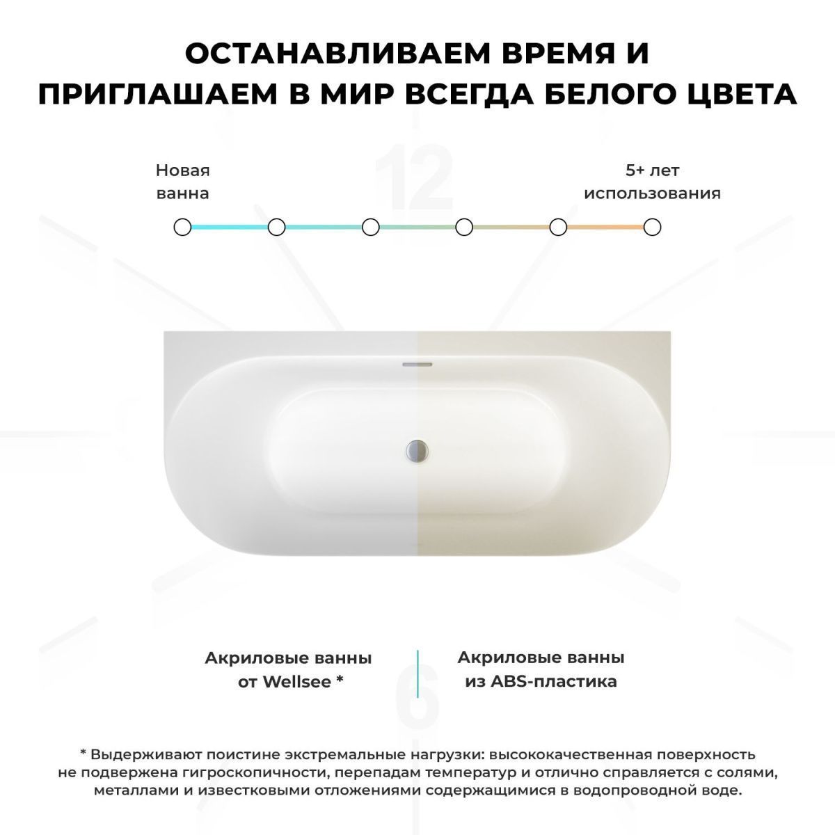 Основа ванн из литьевого акрила — жесткий 5 мм лист полиметилметакрилата (ПММА), полученный из жидкого мономера методом полимеризации. Высокая плотность материала и отсутствие микропор гарантируют гигиеничность ванны и легкий уход без специальных средств. Повышенная стойкость к истиранию, выцветанию и желтизне сохранит эстетичный внешний вид изделия.