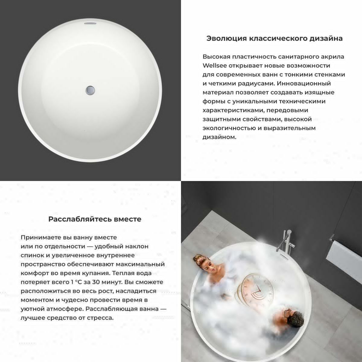 Основа ванн из литьевого акрила — жесткий 5 мм лист полиметилметакрилата, полученный из жидкого мономера методом полимеризации. Максимальная плотность материала и отсутствие микропор гарантируют высокую гигиеничность изделия и легкий уход. Надежные опорные системы прочно фиксируют акриловые ванны Wellsee, исключая любые прогибания корпуса или опрокидывание изделия. Базовое исполнение ванн Wellsee может быть дополнено системами аэро- и гидромассажа, хромо- и ароматерапии, подсветкой, bluetooth-колонками и подголовниками.