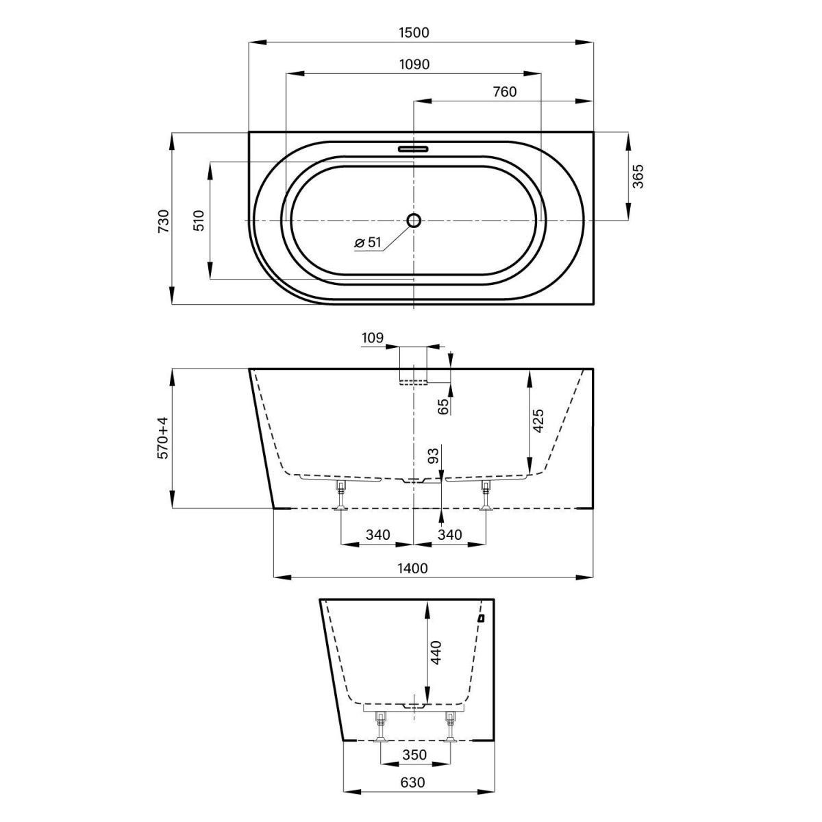 Пристенная ванна из литьевого акрила станет функциональным решением в ванных комнатах с ограниченным пространством. Имитация отдельностоящей ванны достигается за счет несъемной панели, при этом чаша прилегает вплотную к стене. Такой монтаж удобен для купания и принятия душа, предотвращает попадание брызг, пены и мелких предметов за пределы «мокрой» зоны.