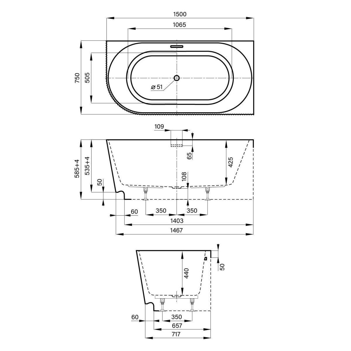 Пристенная ванна из литьевого акрила станет функциональным решением в ванных комнатах с ограниченным пространством. Имитация отдельностоящей ванны достигается за счет несъемной панели, при этом чаша прилегает вплотную к стене. Такой монтаж удобен для купания и принятия душа, предотвращает попадание брызг, пены и мелких предметов за пределы «мокрой» зоны.