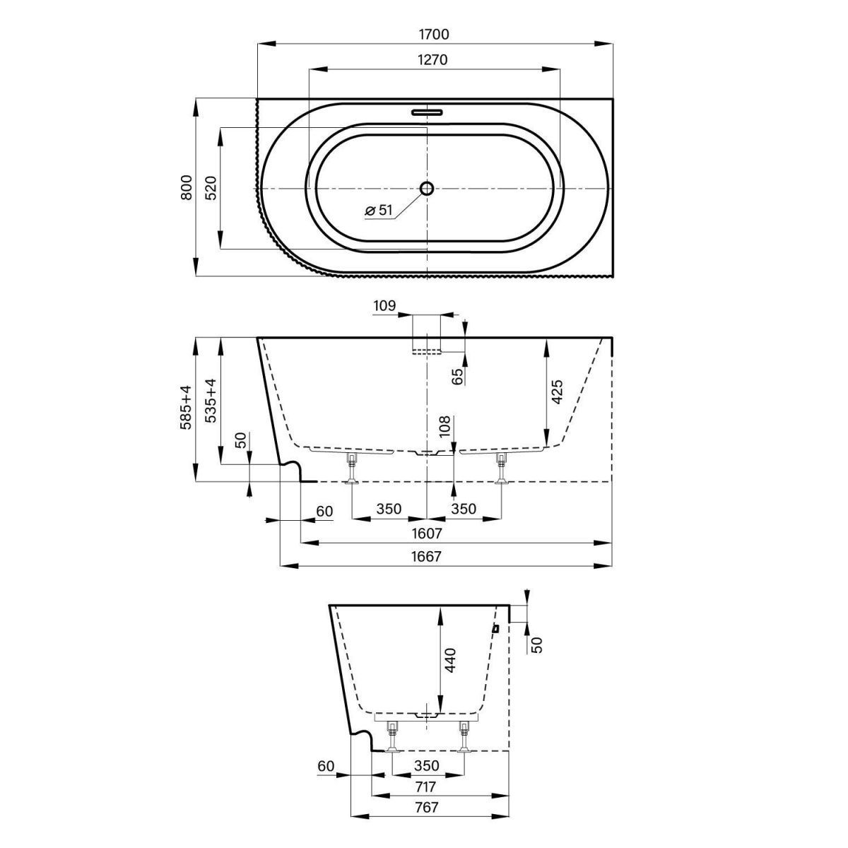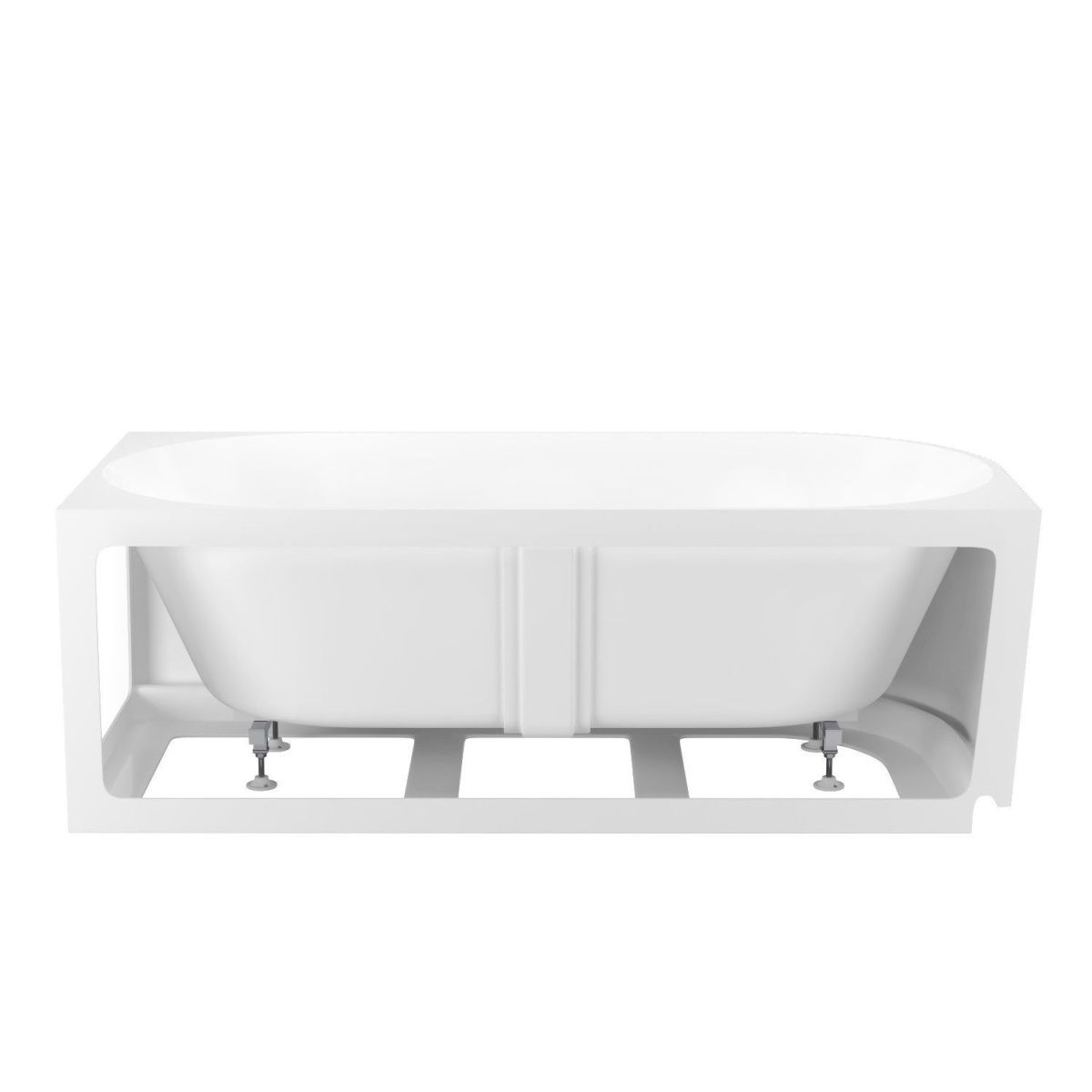 Пристенная ванна из литьевого акрила станет функциональным решением в ванных комнатах с ограниченным пространством. Имитация отдельностоящей ванны достигается за счет несъемной панели, при этом чаша прилегает вплотную к стене. Такой монтаж удобен для купания и принятия душа, предотвращает попадание брызг, пены и мелких предметов за пределы «мокрой» зоны.