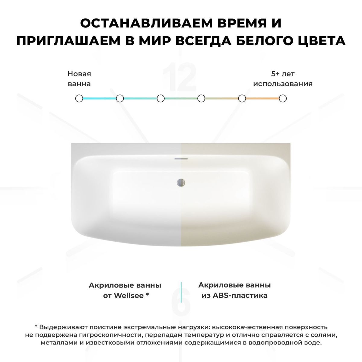 Основа ванн из литьевого акрила — жесткий 5 мм лист полиметилметакрилата (ПММА), полученный из жидкого мономера методом полимеризации. Высокая плотность материала и отсутствие микропор гарантируют гигиеничность ванны и легкий уход без специальных средств. Повышенная стойкость к истиранию, выцветанию и желтизне сохранит эстетичный внешний вид изделия.