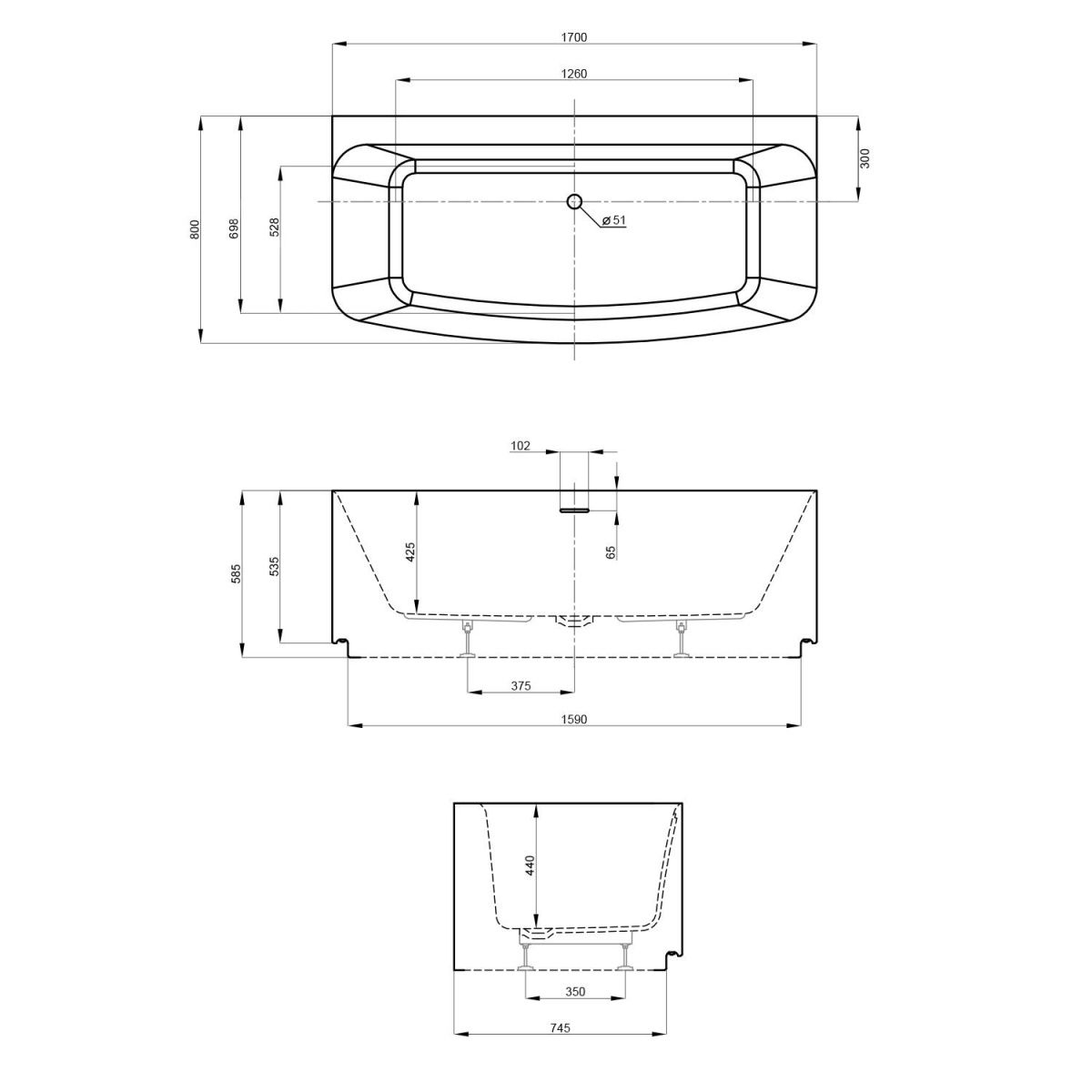 Пристенная ванна из литьевого акрила станет функциональным решением в ванных комнатах с ограниченным пространством. Имитация отдельностоящей ванны достигается за счет несъемной панели, при этом чаша прилегает вплотную к стене. Такой монтаж удобен для купания и принятия душа, предотвращает попадание брызг, пены и мелких предметов за пределы «мокрой» зоны.