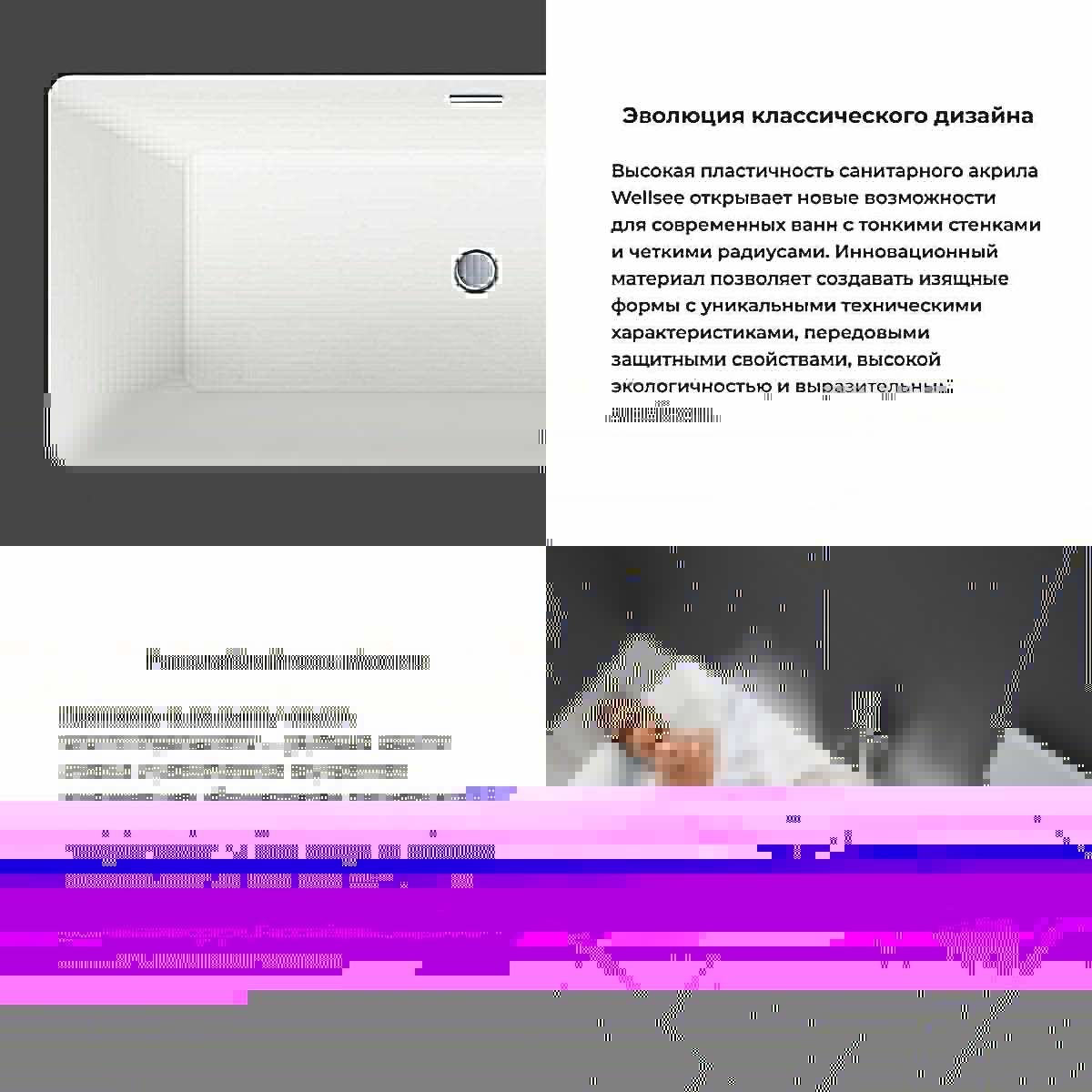 Основа ванн из литьевого акрила — жесткий 5 мм лист полиметилметакрилата, полученный из жидкого мономера методом полимеризации. Максимальная плотность материала и отсутствие микропор гарантируют гигиеничность изделия и легкий уход. Опорные системы прочно фиксируют акриловые ванны Wellsee, исключая любые прогибания корпуса или опрокидывание изделия. Базовое исполнение ванн Wellsee может быть дополнено системами аэро- и гидромассажа, хромо- и ароматерапии, подсветкой, bluetooth-колонками и подголовниками.
