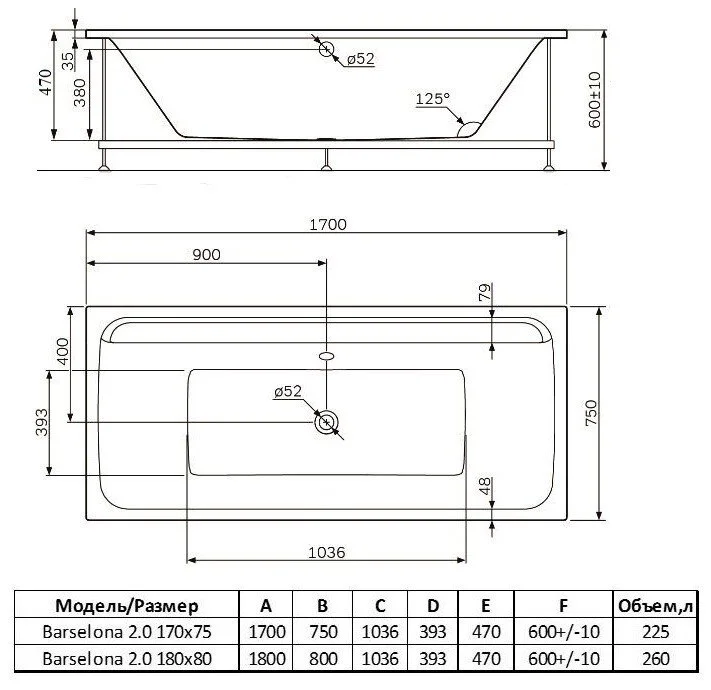 —Ванна акриловая Alba Spa BARSELONA 2.0 ВПР0320200100 170х75 пристенная прямоугольная без ножек