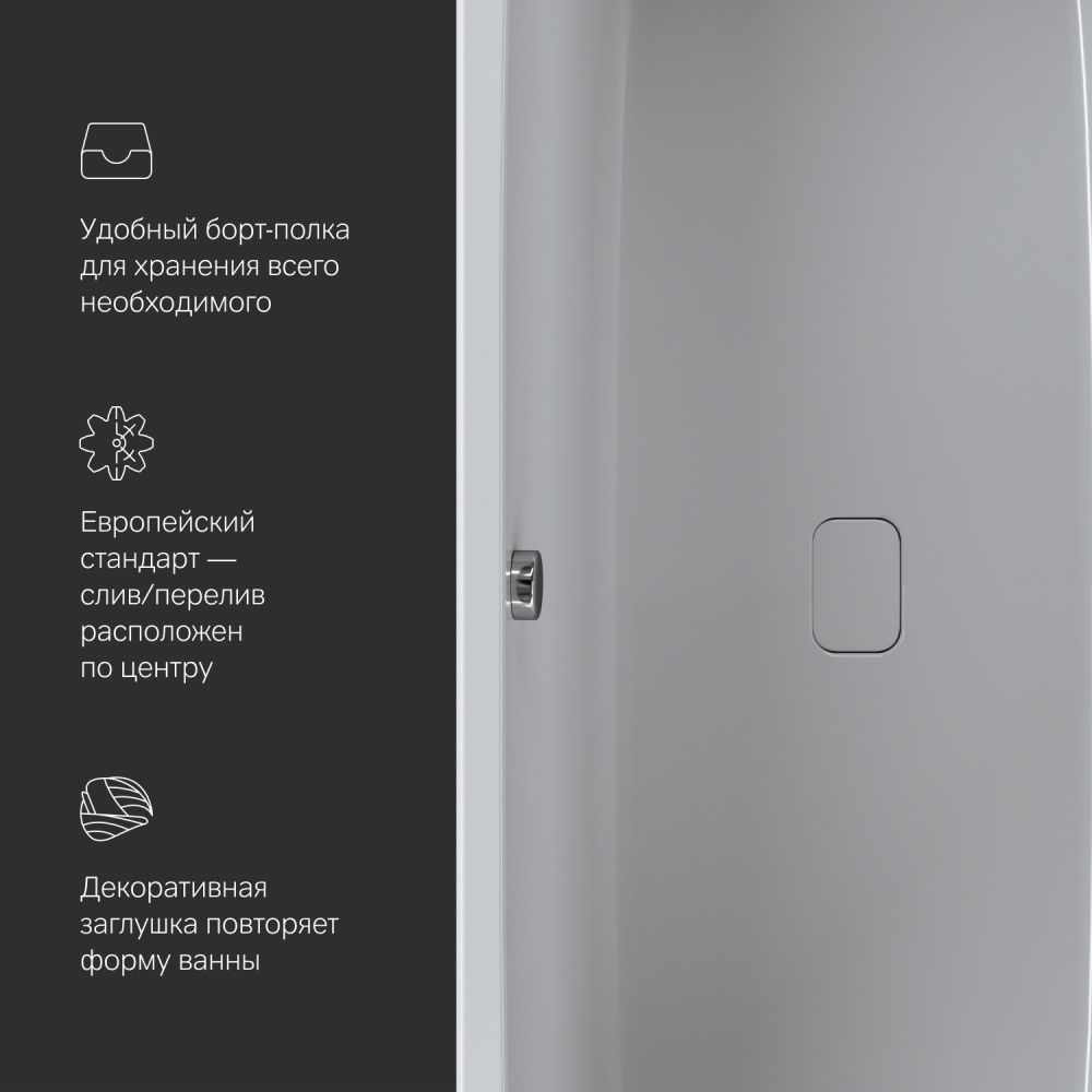 Характерный дизайн: сочетание широкого борта с одной стороны с ультра-тонким бортом с другой стороны создает неповторимую квинтэссенцию стиля. А декоративная заглушка слива повторяющая форму самой ванны станет яркой деталью в интерьере.