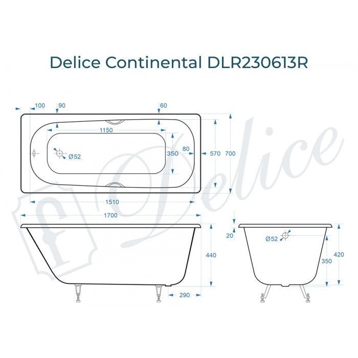 Delice Continental серия Elite в размере 170х70 см производится с ручками, без ручек, с антискользящим покрытием и с гладким дном.