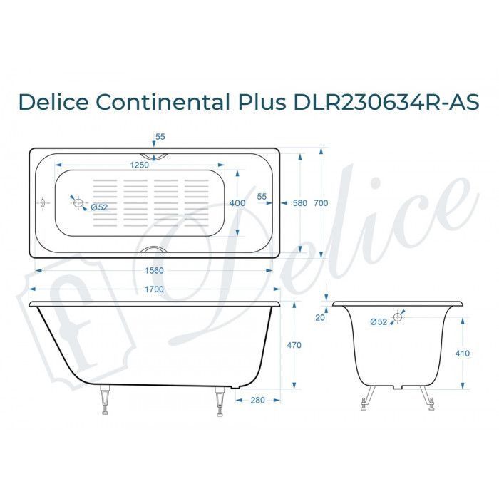 Delice Continental PLUS серия Elite в размере 170х70 см производится с ручками, без ручек, с антискользящим покрытием и с гладким дном.