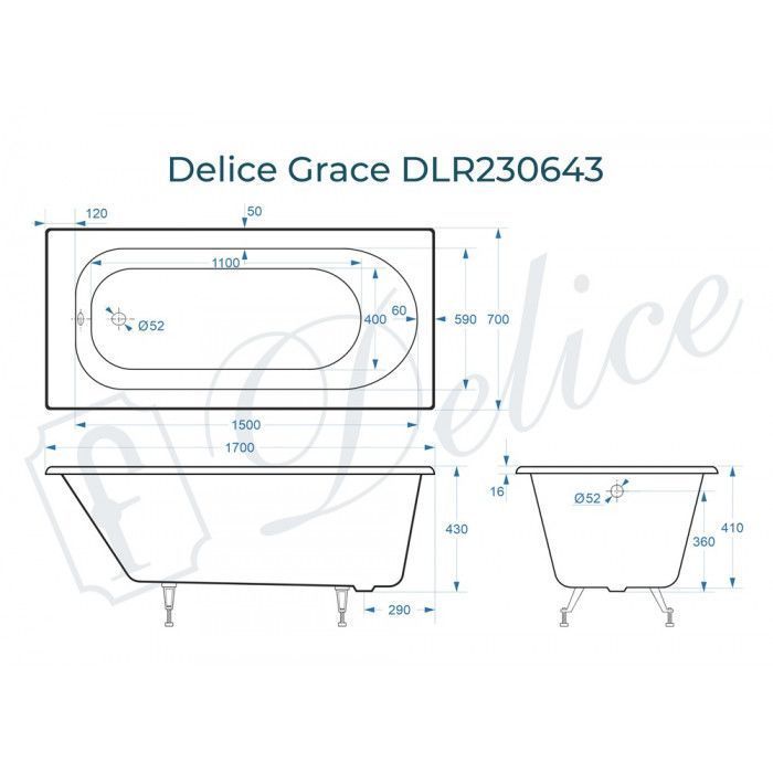 Delice Grace производится в размере 170х70 глубиной 43 см. Доступна модификация с ручками и без ручек, а также с антискользящим покрытием и без него.