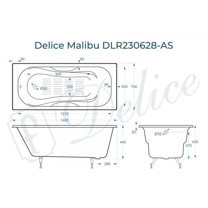 Delice Malibu серия Elite в размере 140х75 см производится с ручками, без ручек, с антискользящим покрытием и с гладким дном.