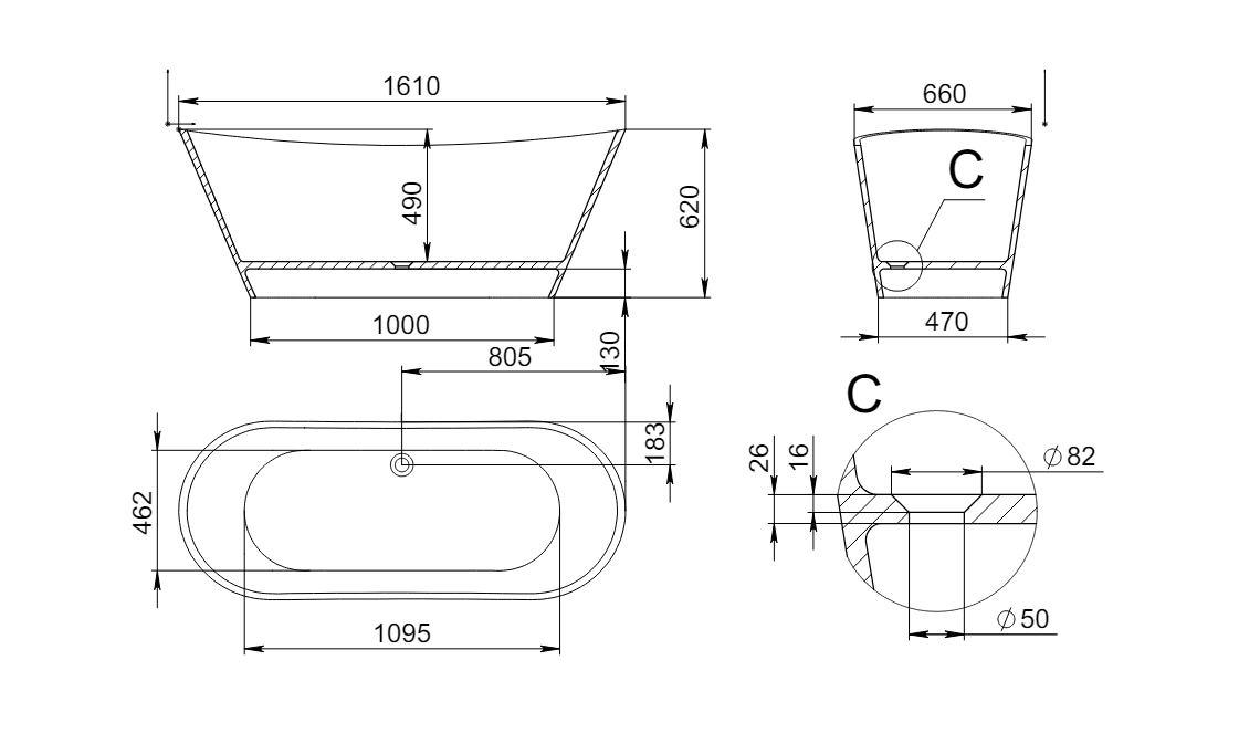 —Ванна из искусственного камня Holbi AFINA 1.01.004.11.2 161х66 отдельностоящая овальная