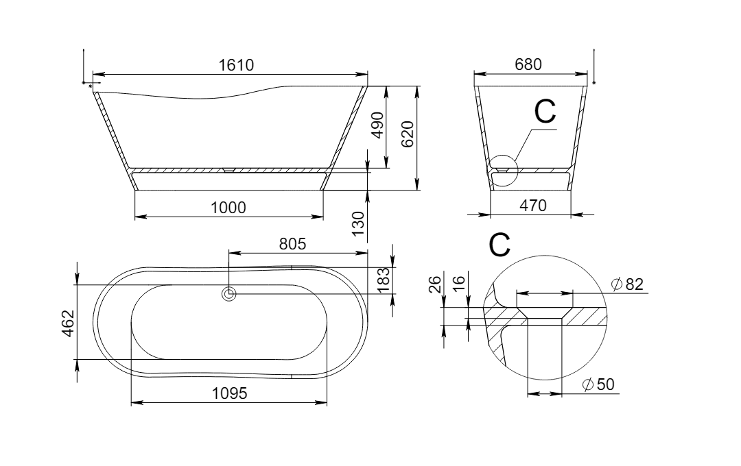 —Ванна из искусственного камня Holbi AFRODITA 1.01.005.11.1 161х68 отдельностоящая овальная