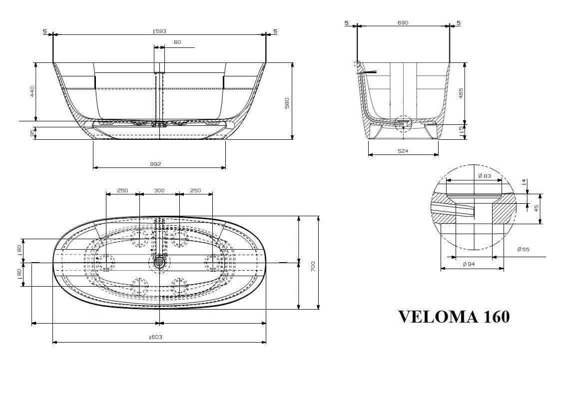 —Ванна из искусственного камня Plumberia Selection Veloma VELOMA 160BD 160х70 отдельностоящая овальная с ножками