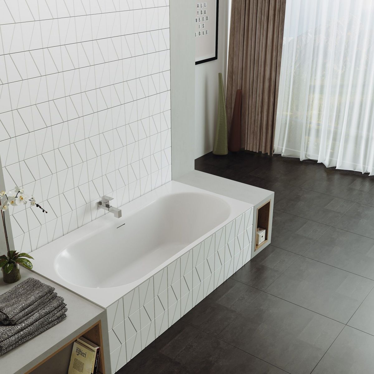 Поверхность ванны приятная на ощупь и не холодная благодаря низкому уровню теплопроводности, что делает процесс эксплуатации очень приятным.