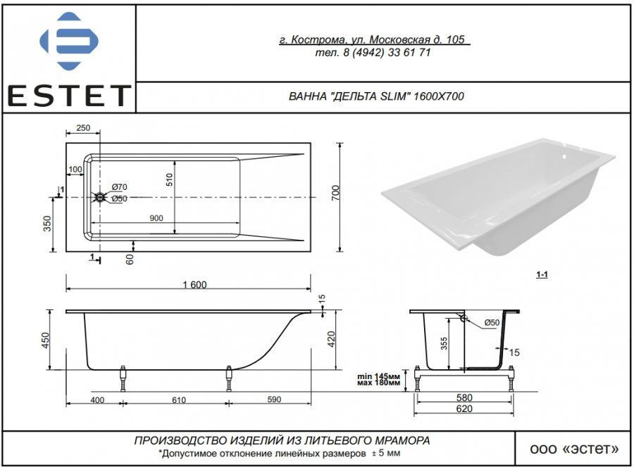—Ванна из литьевго мрамора Эстет Delta slim ФР-00015334 160х70 пристенная прямоугольная
