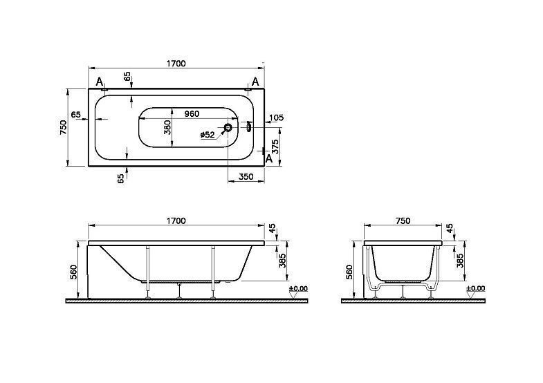 —Ванна акриловая Vitra Optimum Neo 64570001000 170х75 пристенная прямоугольная без ножек