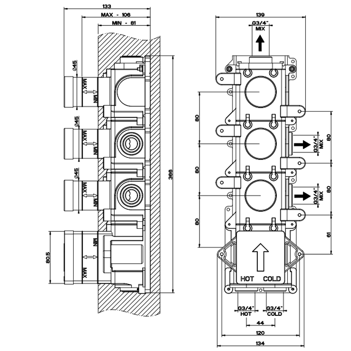 —Внутренняя часть встраиваемого термостатического смесителя с 3мя независимыми выходами Gessi 43105#031