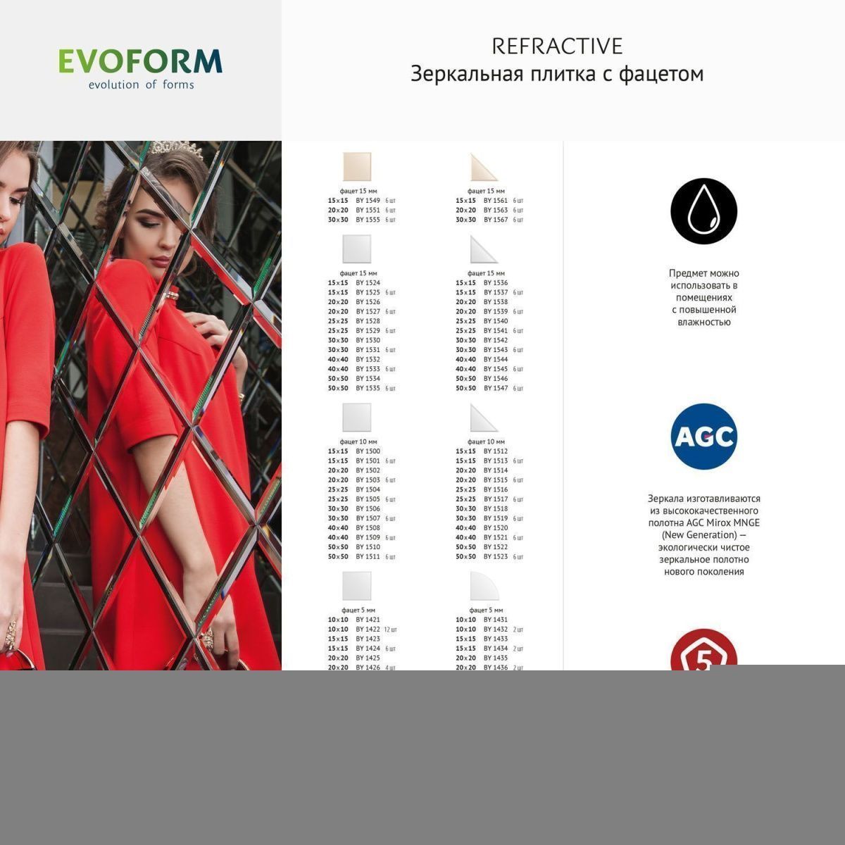 Компания ООО «САНТЕХ АЛЬЯНС» при изготовлении зеркал торговой марки «Evoform» использует серебряные зеркальные полотна мирового производителя AGC- Asahi Glass Co (Япония). AGC - первая компания, применившая новейшую технологию Mirox, которая стала мировым эталоном. Mirox New Generation Ecological - это новое поколение экологически чистых, высококачественных, стойких к воздействиям зеркал, характеристики которых превосходят требования самых строгих стандартов. ПРЕИМУЩЕСТВА: Высокие антикоррозионные свойства; Способность готового продукта противостоять химическим повреждениям; Срок полезного использования в 3 раза превышает аналогичный показатель традиционных зеркал; Повышенная стойкость к абразивным средствам очистки: в семь раз выше, чем у традиционных зеркал; Отсутствие точечной коррозии и «цветения» с течением времени; Сертификация Cradle to Cradle - безотходная система производства; Испарение летучих органических соединений и формальдегида сведено к минимуму; Устойчивы к высоким температурам при равномерном нагревании (до 80°C).  Компания располагает современным оборудованием, владеет новейшими технологиями и имеет в штате квалифицированный персонал. Высоких стандартов качества продукции предприятию удается достигнуть благодаря использованию специализированного оборудования ведущих европейских производителей и высококачественного экологически безопасного зеркального полотна. Широкий модельный ряд позволяет максимально удовлетворить самые разнообразные пожелания покупателей. ООО «САНТЕХ АЛЬЯНС» уже много лет производит и реализует зеркала для ванной комнаты, зеркала изготавливаются с соблюдением всех необходимых условий производства. По праву можно назвать наш ассортимент одним из самых больших среди европейских производителей, работающих со складским остатком.