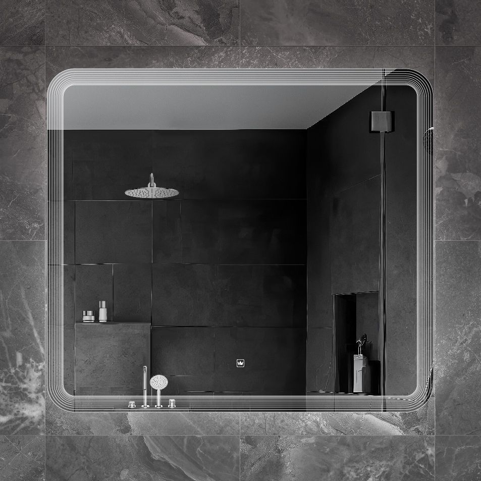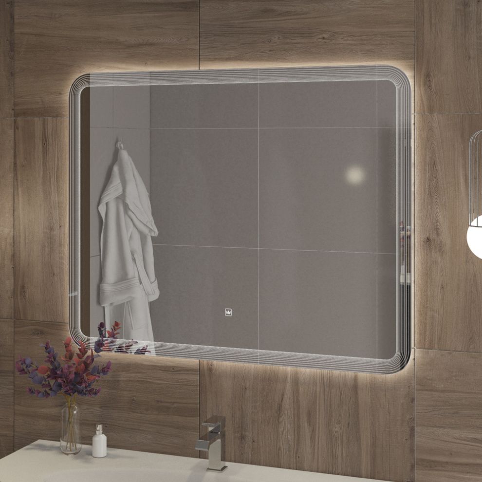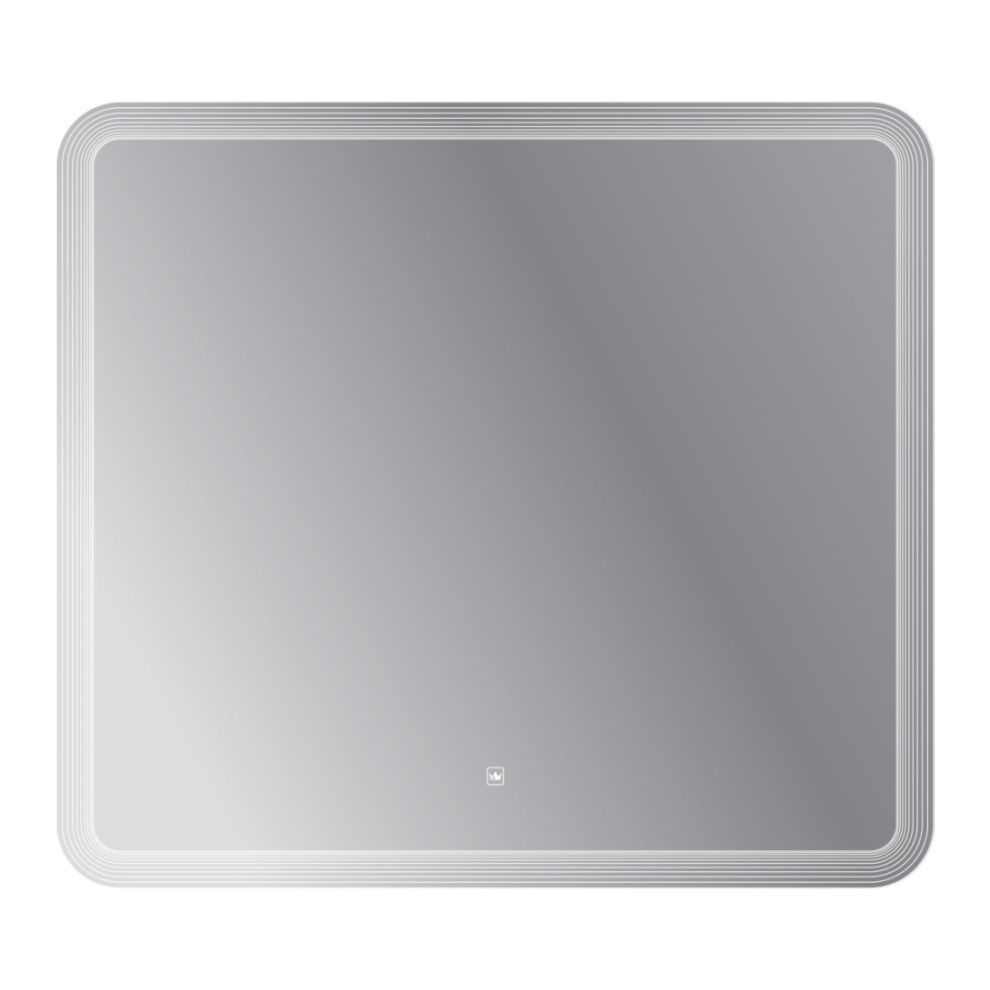 Зеркало 90x80 прямоугольное с сенсорным выключателем на прикосновение и лазерной гравировкой по периметру.  Корпус изделия выполнен из  пластика. Cветодиодная лента установлена снаружи корпуса в силиконовой оболочке(повышенной влагостокости). Диммер с возможностью регулировки яркости свечения. Лента SMD 3528, IP 44, 12V, 4200 К, холодный свет. Навесы имеют регулировку по горизонтали 1.5 см. Крепеж для монтажа прилагается.