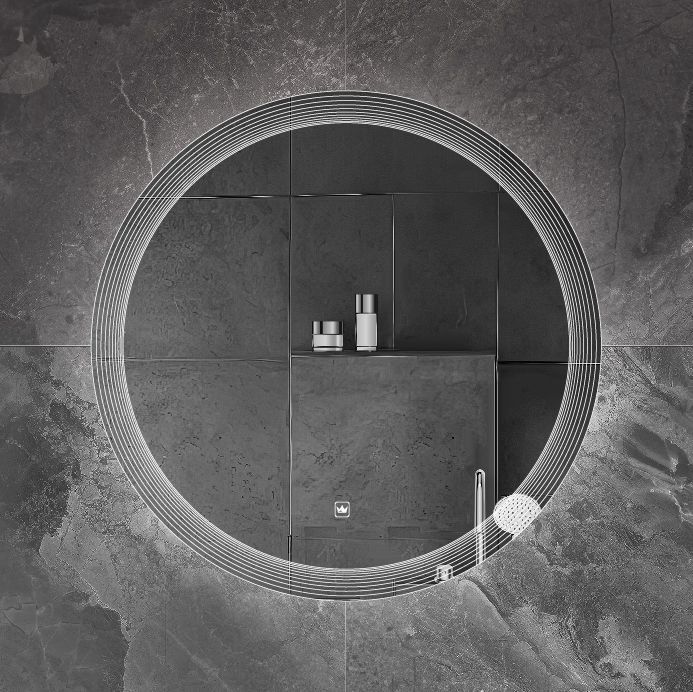 Зеркало 60x3 круглое с сенсорным выключателем на прикосновение и лазерной гравировкой по периметру.  Корпус изделия выполнен из  пластика. Cветодиодная лента установлена снаружи корпуса в силиконовой оболочке(повышенной влагостокости). Диммер с возможностью регулировки яркости свечения. Лента SMD 3528, IP 44, 12V, 4200 К, холодный свет. Навесы имеют регулировку по горизонтали 1.5 см. Крепеж для монтажа прилагается.