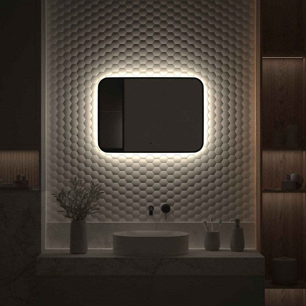 Светодиодная подсветка с цветовой температурой 4500 Кельвинов обеспечивает яркость и комфортную атмосферу в любое время суток. Это зеркало оборудовано встроенным инфракрасным выключателем с регулировкой яркости и может быть легко подключено к подготовленному электро-выводу из стены.