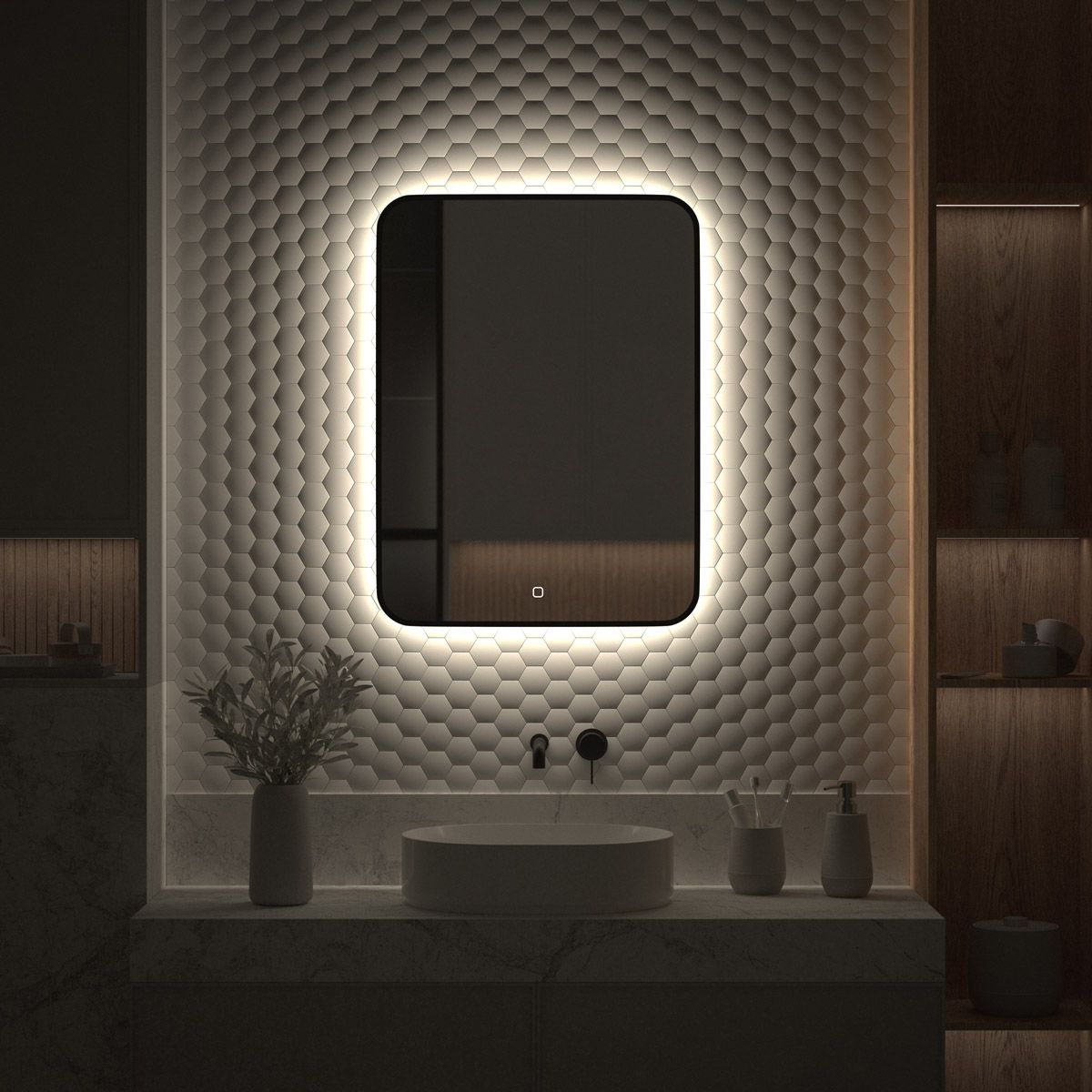 Светодиодная подсветка с цветовой температурой 4500 Кельвинов обеспечивает яркость и комфортную атмосферу в любое время суток. Это зеркало оборудовано встроенным сенсорным выключателем с регулировкой яркости и может быть легко подключено к подготовленному электро-выводу из стены.