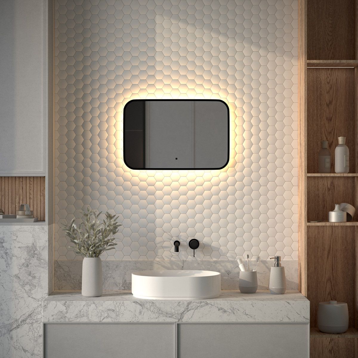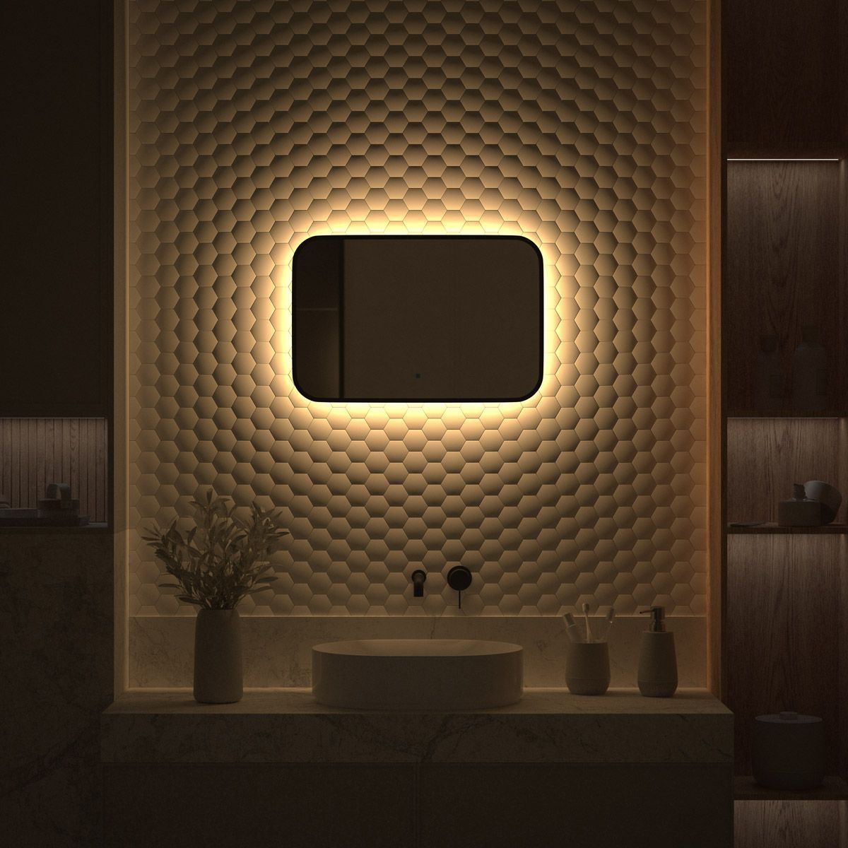 Светодиодная подсветка с цветовой температурой 3000 Кельвинов обеспечивает яркость и комфортную атмосферу в любое время суток. Это зеркало оборудовано встроенным инфракрасным выключателем с регулировкой яркости и может быть легко подключено к подготовленному электро-выводу из стены.