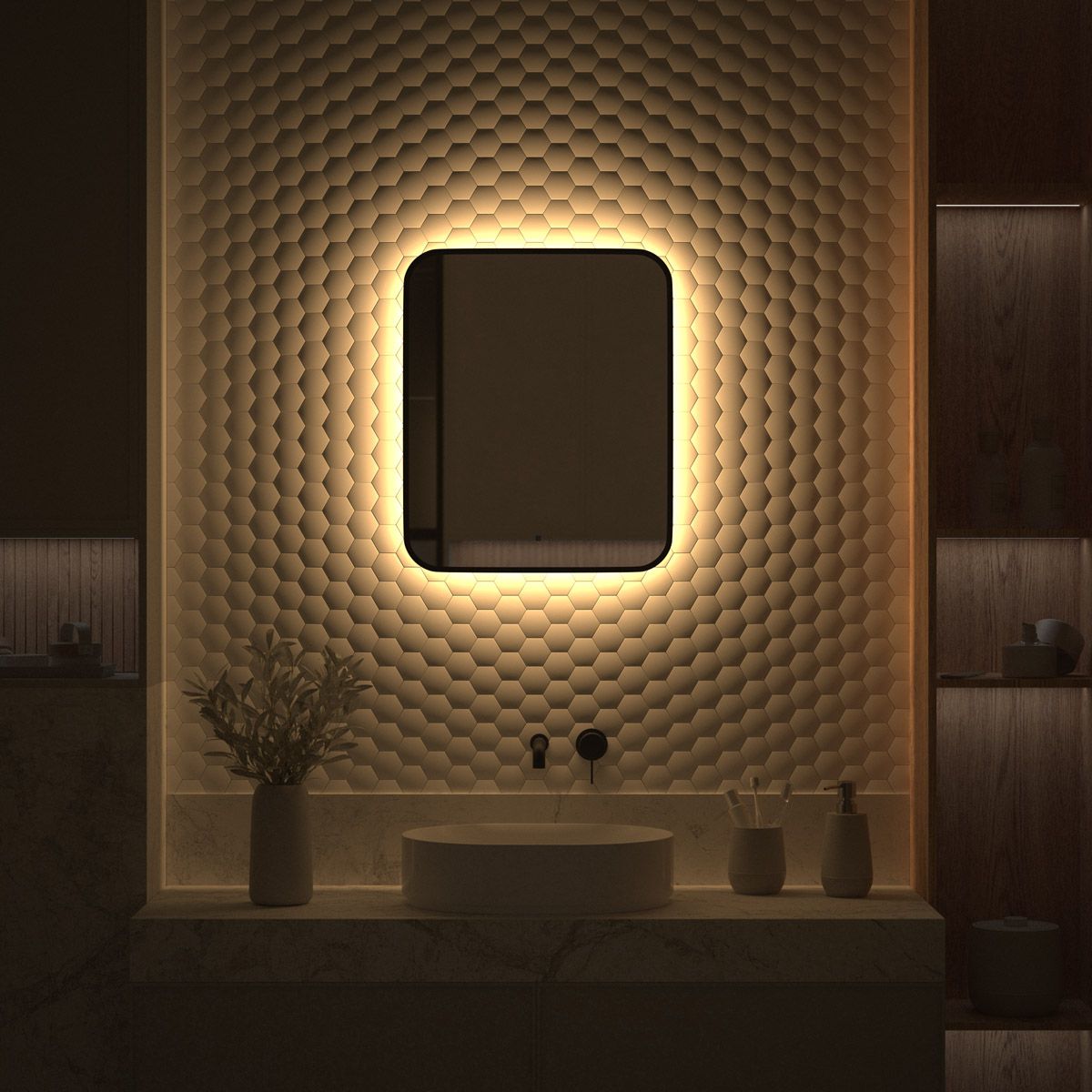 Светодиодная подсветка с цветовой температурой 3000 Кельвинов обеспечивает яркость и комфортную атмосферу в любое время суток. Это зеркало оборудовано встроенным инфракрасным выключателем с регулировкой яркости и может быть легко подключено к подготовленному электро-выводу из стены.