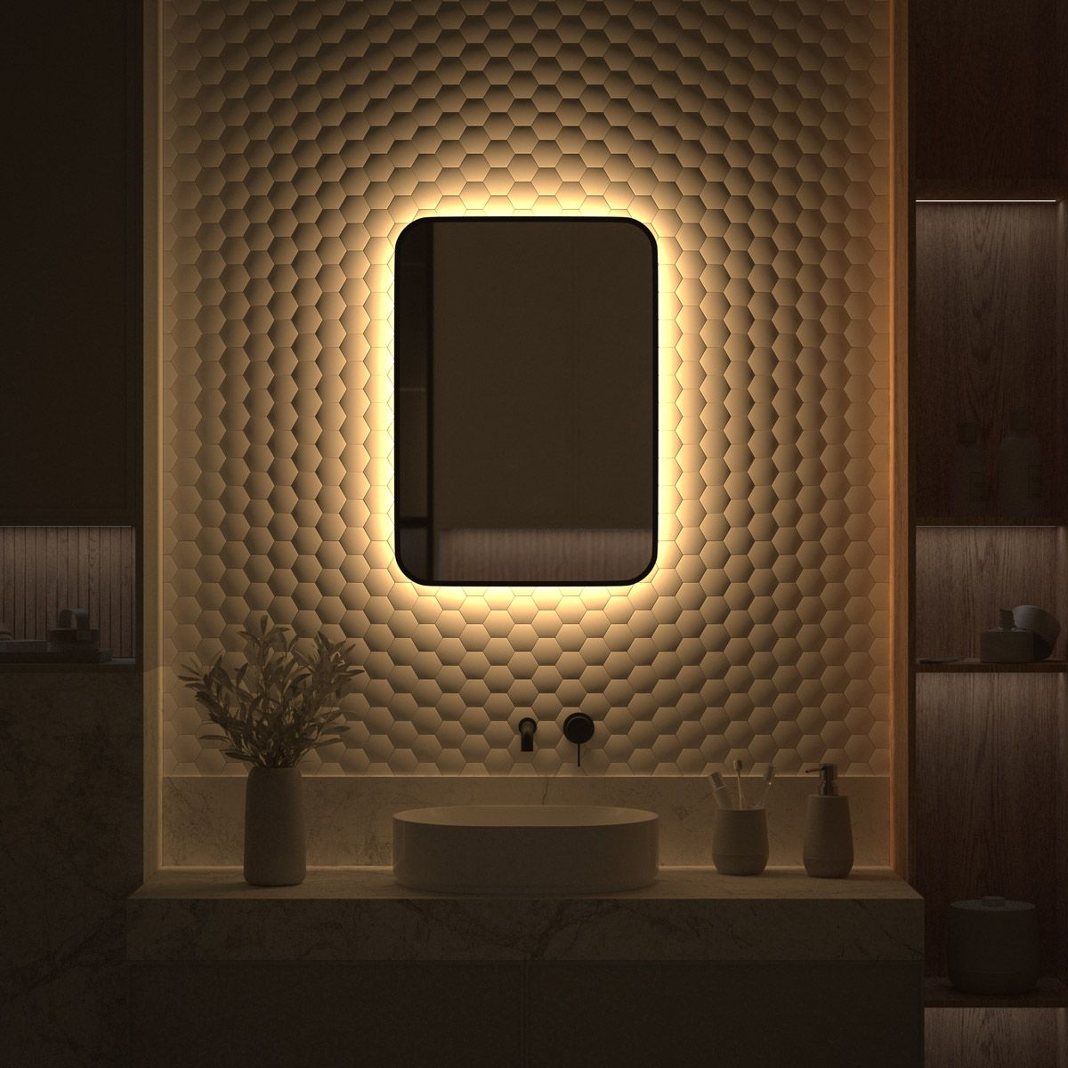 Светодиодная подсветка с цветовой температурой 3000 Кельвинов обеспечивает яркость и комфортную атмосферу в любое время суток. Это зеркало не имеет выключателя и может быть легко подключено к подготовленному электро-выводу из стены. Возможен как вертикальный, так и горизонтальный монтаж.